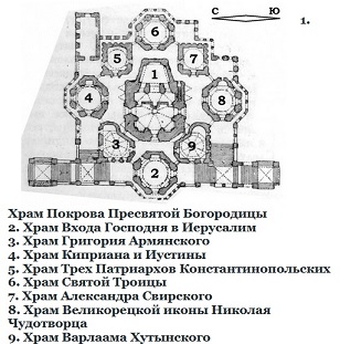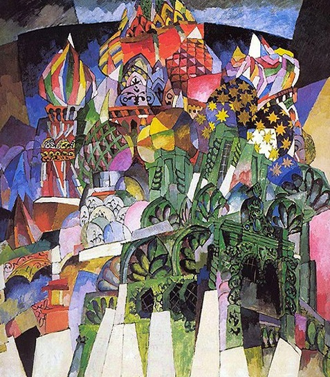 Лентулов. Собор Василия Блаженного. 1912. Холст, масло, коллаж. Например, тому, что купол церкви Святой Троицы не жёлто-зелёный (витой), а жёлто-синий (тоже витой)… Или тому, что купол церкви Григория Армянского не цельно-решётчатый (из зелёных решёток), а вдруг с цельным фиолетовым куском. Или где похвала тому, что церковь Входа Господня в Иерусалим (с пупырчатым куполом) в действительности с очень видной башней под этим куполом у Лентулова башни лишена? Вы читали где-нибудь, чтоб хоть какой-то элемент искажения в этой картине был бы похвален? Вот похвала несуществующему: "Но, несмотря на такой нестандартный вид картины, автор смог изобразить каждую деталь…” (https://muzei.club/vasilij-blazhennyj). Ага, каждую. А где выше упомянутая башня под пупырчатым куполом? "Левый угол вверху заполнен черными облаками, а ниже [наверно, не просто ниже, а и правее] присутствует тревожный красный цвет [я б не назвал его тревожным – он слишком не насыщенный; но в действительности есть таки красного кирпича основание под шатром главной церкви, Покрова Пресвятой Богородицы]. Прекрасный и яркий мир [религии] в предчувствии своего скорого разрушения [имеется в виду упадок религии после Октябрьской революции]. Только это разрушение никогда не коснется собора [лишь случайно не коснулось; легенда гласит, что реставратор Барановский, который был приглашен по вопросу о сносе в Кремль, встал перед собравшимися членами ЦК на колени, умоляя сохранить культовое строение, и это неожиданно подействовало] – он вечен. Именно изображение собора, как вечная и богатая архитектура, было целью автора” (Там же). Как-то сомнительно, чтоб в 1912 году общий хаос изображения и красный цвет в одном месте, сомнительно тревожный, могли выражать неколебимость, хоть я сам считаю верным такое именование Лыскова событий того времени: “Великая русская революция, 1905-1922”. – Скорее, это так называемая модернизация автора высказывания, натягивание злободневной актуальности на произведение прошлого. – РПЦ-то воинствует теперь до степени неприличия. Вот подпевалы и пристроились. Но я таки нашёл попытку конкретное искажение натуры похвалить и обосновать идеей. Правда, попытка позорная. "Белые геометрические формы на переднем плане — это Васильевский спуск” (https://kraeved1147.ru/lentulov-popova-ekster-falk/ ). То есть хвалят искажения за не потерю некой точности относительно действительности. А не зря хвалят? Васильевский спуск находится на юго-восток от храма.