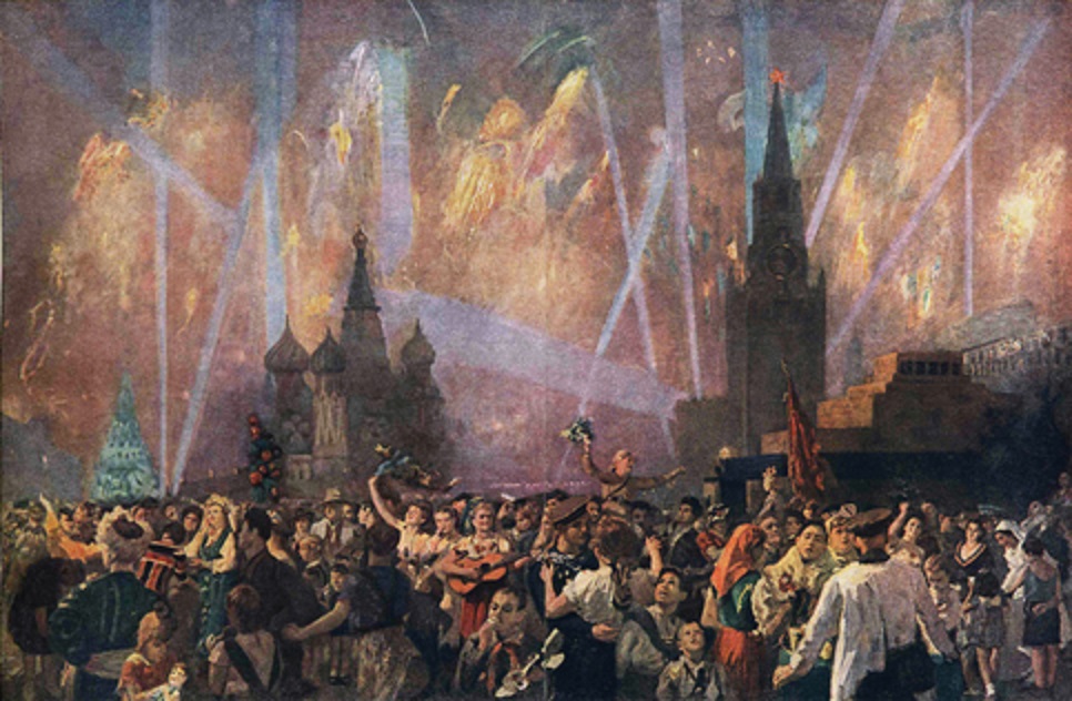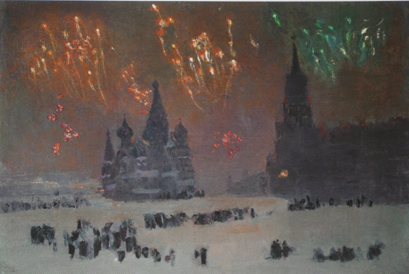 то почувствовал, что такая б меня не остановила. Но зато вторая заронила мысль, что хотел сказать автор. А ещё, возможно, первая меня потому остановила, что озадачила. Я никак не мог предположить, как её толковать. А недопонятность для меня в последние годы является решающим признаком художественности, как маркировка присутствия подсознательного идеала автора в создании вещи. Мучаясь, что б это могло значить, я было занялся неискусствоведческим делом. Стал искать, что это за очередь выстроилась на Красной площади. Неужели в мавзолей Ленина? Но ночь ведь… И я нашёл, что тело Ленина было тогда в Тюмени. Вернулось в мавзолей только весной 1945-го. А перед нами зима 1945-го. Но уже и с цветистым вариантом стала пробиваться мысль, что уж больно разные низ и верх. А с тусклым вариантом стало совсем ясно, что людям в их трудной жизни не до салюта. И в самом деле. Сотни салютов уже были к 1945 году в Москве. Люди могли и привыкнуть. А то пренебрежение по сравнению с собственно салютом, с каким нарисованы люди, говорит об обиде на власть, слишком уж занятой общим в пику частному. Это эскиз. В нём легче увидеть намерение автора, тем паче, если он движим подсознательным (мещанским тут) идеалом, сознанию автора не данным. И какая ложь получилась через 2 года, когда всем распоряжалось сознание.