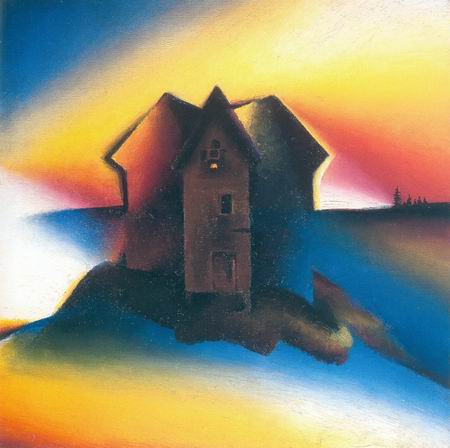 Из-за того, что там север, там необычная безвлажность воздуха бывает и оттого яркость красок. Что само по себе внушает какую-то ирреальность. Она и для религиозного бегства из плохой жизни хороша, и для враждебного религии бегства (назовём его бегством в метафизическое иномирие). А второе есть ницшеанство. И хочется, чтоб вы согласились, что художник умеет не додумывать до философской определённости своё настроение, то есть я предлагаю согласиться, что это – подсознательный идеал. Он от религиозного отличается, потому что тот осознаваемый и принципиально достижимый (после Второго Пришествия настанет Царствие Божие на небе с бестелесными душами, душами тех, кто прощён). А ницшеанский и неосознаваемый, и принципиально недостижимый. Только для умеющего выразить его образом он как бы достижим, и для как-то почуявшего его восприемника – тоже. Кто не способен такое представить себе, тот не получит полное удовольствие от дальнейшего чтения. Я хочу показать, что вот Недостижимость-то как раз тут и выражена. А здесь это удалось потому, что тут произведена маскировка холста под белую бумагу. В каком-то приближении на белой бумаге – из-за её белизны – не видна фактура этой бумаги. Ну и гладкость играет роль, конечно. В общем, она представляется бескачественной. При соответствующей белой грунтовке холст тоже представляется таким же бескачественным. И вот имеется плоскость этой белой грунтовки. И плоскость эту можно понимать двояко. Как прозрачную, сквозь которую видны изображённые дали (синь Белого моря, заря в небе, даль острова с еловым лесом, да и этот дом глубже находится, чем дёрн перед ним). А можно плоскость эту понимать как то, на чём наложены масляные краски (что так думать заставляет не всюду их наложенность, да и явный ненатурализм изображённого, эта акцентированность красочности красок, наплывы их, где вредно для изображения). И в результате – перед нами сама Неопределённость: с какой же плоскостью мы имеем дело. – Нет, вдумайтесь: сама Неопределённость! Как образ принципиальной недостижимости метафизического иномирия. И тем не менее она как-то достигнута, а Всё Остальное в Этом мире – гори огнём! . Это я умудрился своими словами пересказать лекцию о концептуальном искусстве доктора искусствоведения, профессора МГУ М.М. Аленова. Выдержки из неё можно прочесть тут. Там и о Кабакове. А вот слова Олега Васильева, демонстрирующие, насколько не дан его сознанию сам концептуализм и, тем более, принципиально недостижимое метафизическое иномирие, являющееся подсознательным идеалом всех непритворных ницшеанцев: "…был такой момент, когда всех неофициальных художников вдруг стали называть концептуалистами. И поскольку какие-то существовали круги близких людей — скажем, я дружен с Кабаковым с художественной школы, более 40 лет уже нашей дружбе, — Кабаков — концептуалист, значит, и Васильев тоже концептуалист. …Я преклоняюсь и отдаю должное тем художникам, которые отстаивали право и возможность показа своих работ. Однако для меня путь общественно-политической борьбы (а я оцениваю это именно так) был невозможен: я бы не смог сочетать это с моей профессиональной работой. Так что в этом движении не принимал участия и даже активно уклонялся, занимаясь только своим. Однако в нашем “социуме” даже такая позиция — занятие только профессионал
