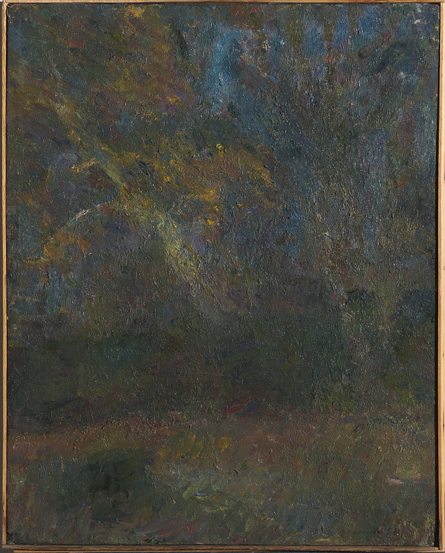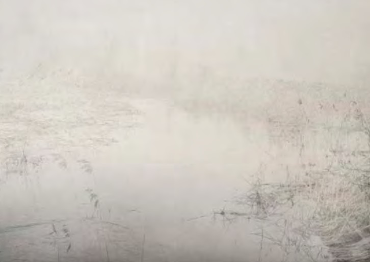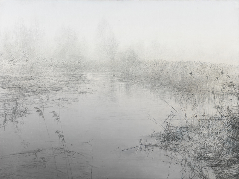 Васильев. Север России. Паводок. 1996. Холст, масло. Десять лет спустя чёткости намного больше. И ещё мне ранняя вещь открыла, что в обеих изображено довольно сильное течение. А вглядевшись после этого в позднюю, видно, что и ветер есть – отражение в воде во многих местах портится рябью. Ветер дует справа налево. Это показывает у всех в одну сторону повернувшиеся колоски вейника наземного. И есть в картине невероятность – как много и далеко видно, несмотря на туман. Видны просветы неба в дальней группе деревьев слева. И они не натуральные: выполнены тончайшими почти белыми строго вертикальными штрихам – все абсолютно одинаковой толщины. Не то, что небо за дальним, полностью облетевшим деревом в центре. Странно: почему так неодинаково? О. Ещё странность. Вейник на берегу слева наклонён в противоположную сторону, чем колоски его на переднем плане. То есть через 10 лет художник принялся насыщать картину противоположностями. Он хотел “сказать”, что не надо доверяться первому впечатлению – тишине и обездвиженности? Кавычки я поставил, имея в виду, что это делалось помимо сознания. Но тогда что “хотело” выразить подсознание? – Непостижимость? И, получается, что меня везение опять выручило… Надо и впредь, полагаясь на него, начинать писать, не зная, что выйдет. С Олегом Васильевым не соскучишься, однако. 28 января 2022 г.