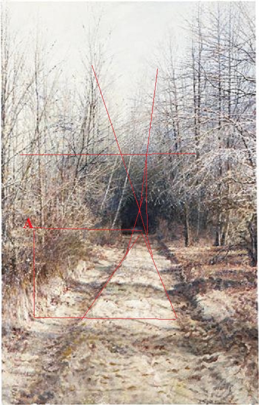 Тут несколько точек схода линий перспективы. На передний план взгляд вниз с высоты человеческого роста (А). На среднем плане точка зрения взлетает на треть высоты дерева, если заинтересуемся высотой деревьев в том месте, где начинается густая тень. А начинается густая тень резко. С чего бы это? Лес зимний, голый, довольно прозрачный. Что подтверждается освещённостью ближнего плана. Если же продолжить влево горизонталь высоты тех деревьев, что стоят при начале густой тени, то видим благодаря прозрачности ближнего леса, что слева там небо. Там вообще нет леса! С какой стати на дроге образовалась такая густая тень?! – Это обман? Или это образ Неизвестности о том, что есть вне Этого мира… Куда так тянет вон из мира Этого, скучного своей закономерностью… Вот теперь меня, может, Васильев отпустит. Интересно только, можно ли представить, что он всей этой философии, что мне ясна, не имеет в сознании? – По-моему, можно. Художника ж, как дети. Убогие – у Бога... 30 января 2022 г.