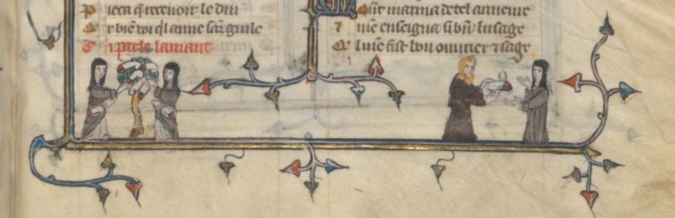 Жанна де Монбастон. Монахини, срывающие пенисы с дерева. XIV век. "…перед чудотворными иконами развешаны по обету изображения половых органов, исцеленных этими иконами” (Лосев). Стиль – не натуралистский (натурализм связан с гуманизмом). Как бы чертёж пениса. И Леонардо в таком же стиле к этой оборотной стороне титанизма приобщается (что нужно хотя б для того, чтоб со знанием дела вызывать у позирующей Моны Лизы похоть).