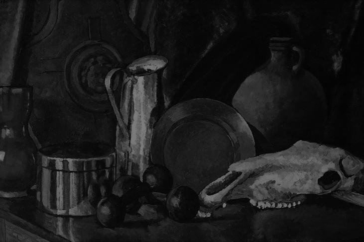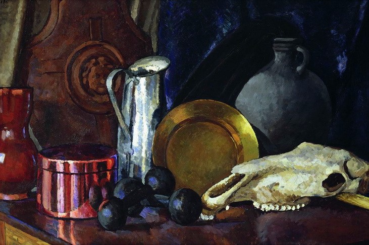 Машков. Натюрморт с лошадиным черепом. 1914. Отталкиваться тут я буду от того, что когда-то навело меня на пробуддизм у них – на гипнотизирующее нечто. Для медитации надо сосредоточиться на чём-то одном, чтоб остальное ушло из поля внимания. Гипнотизёры пользуются блестящим шариком. Блестящие предметы тут есть. Но они связаны с едой. В кастрюле, тазу, кофейнике – варят. Это – активность. Зато череп – пассивность. – Вот и сравним, какое место на картине самое светлое: связанное с активностью или с пассивностью. Возьмём блик на тазу, на кастрюле и на кофейнике и сравним его по светлоте с белыми зубами черепа (предметы я рассматриваю в порядке идеологически ожидаемой мною всё большей светлоты; белый цвет имеет каждого из основных цветов по 255 едини).