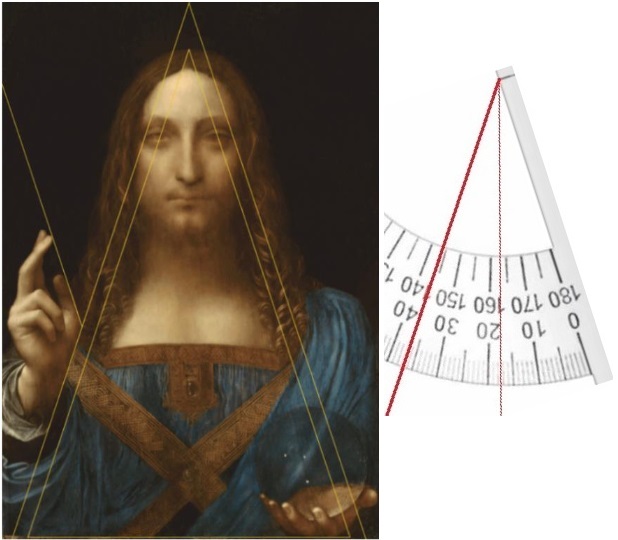 Доводит меня (смейтесь) неприятие искусство- и литературоведами художественности по Выготскому: что это подсознательный идеал. 57 лет прошло, как опубликована была “Психология искусства”. И – шиш. Никто не применяет. А только что мне пришёл на ум ещё один довод о существовании этого подсознательного идеала. Вы, читатель, надеюсь, согласитесь, что у слова “гармония” есть, минимум, два смысла: 1) стройность и 2) согласование разнородных и даже противоположных (конфликтных) элементов. Когда поднялся шум из-за перепродажи “Спасителя мира” (около 1499) Леонардо да Винчи, я возмутился этой второстепенностью и опубликовал (см. тут) в журнале статью об истинной ценности этой картины – наличии следа подсознательного идеала – гармонии низкого и высокого. То есть тут второй вариант значения слова “гармония”. И вдруг я читаю, что в этой картине Леонардо применил сведение, почерпнутое из книги математика Луко Пачоли “О божественной пропорции” (1498), - сведение, заставляющее художника осознанно ввести в эту картину божественное качество образом стройности, т.е. первым значением слова “гармония” (а именно – углом 36 градусов в равнобедренном треугольнике: 2 зрачка и макушка). Даю репродукцию, заодно проверю, действительно ли там 36 градусов.