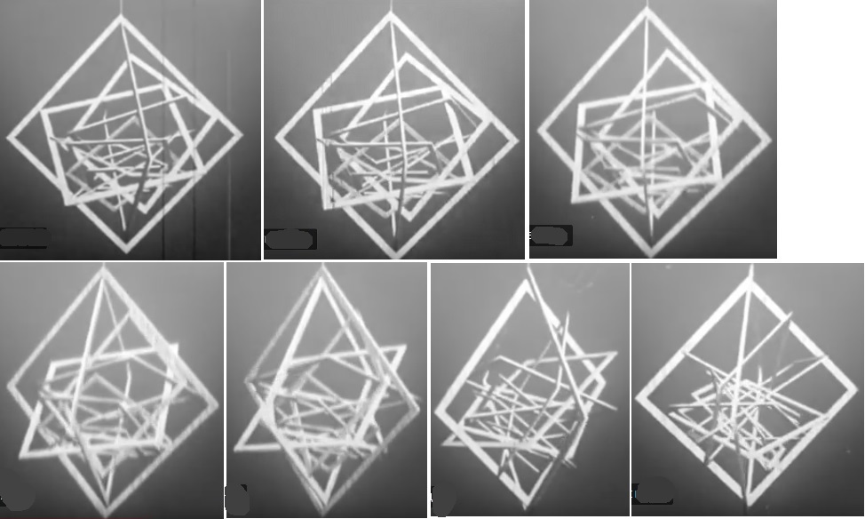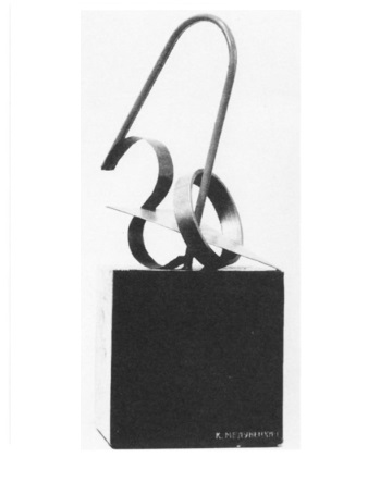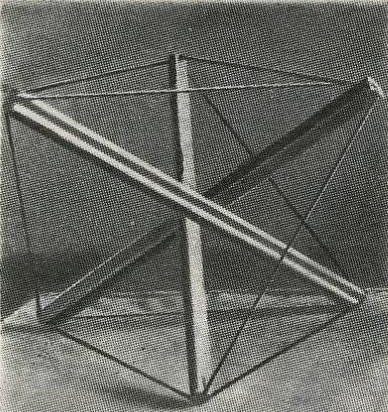 Медунецкий. Пространственная конструкция. 1920. Четыре предмета так заклинивают один другого, что конструкция, никак иначе не скреплённая, может как угодно быть повёрнута и не распадётся. У Родченко целесообразность усиливалась, если получались "сборно-разборные вещи, в разобранном виде компактно-складируемые (все элементы плоскостные)." (https://cyberpedia.su/10x3f6a.html).