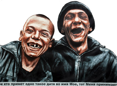 Дмитрий Врубель, Виктория Тимофеева. “Матфей.18,6.”. Из серии “Евангельский проект”. 2008. Акрил, виниловый холст. и содрогнулся от омерзения. Это воздействие жизни, непосредственное и принуждающее, а не искусство (условность, воздействующая непосредственно и непринуждённо). А воздействие жизни всегда сильнее, чем воздействие искусства, даже и прикладного, призванного усиливать знаемое (здесь – бедность в России в 2008-м: 19,0 млн., 13,4% от общей численности населения страны - http://global-finances.ru/uroven-bednosti-v-rossii-po-godam/). Фотография ж претендует на невыдуманность (выдуманность же в первую очередь нужна для условности). Кусок, мол, действительности запечатлён в фотографии. Кусок жизни. А та – действует принуждающе. Это маскировка, что с фотографиями что-то делают, а не применяют напрямую: "Основной метод Врубеля и Тимофеевой - модификация фотореализма с использованием современных технологий” (http://sasharomanov.com/permm/newtestament.html). “…на основе фотографии создается эскиз. Он, в свою очередь, сканируется и переносится на огромный лист во всю стену, который закрашивается в характерной экспрессивной манере” (https://ria.ru/20090407/167550487.html). Рассказ Врубеля Бавильскому разоблачает невыдуманность. Жизнь то есть. Это не искусство, а околоискусство. Изопублицистика. К тому же врущая (из-за остановки мгновения), дескать, вечно Россия бедная. Тогда как на данном отрезке времени народ просто поддался обману предателей и выкарабкивается (% бедных по годам):