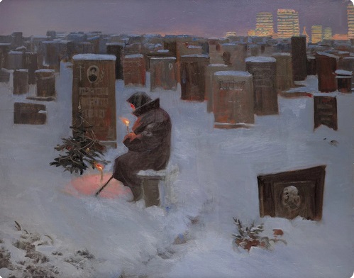 Из пальца сосал? Мне фамилия художника Андрияка казалось знакомой. Я полез искать, не писал ли я о нём. Оказалось, что писал, но ещё не опубликовано. Перечитал. Раскритиковал я там одну его картину в пух и прах. Но не смог совладать с чувством и другую признал многозначительной. Год создания меня впечатлил. 1991. И я подумал, а не позволить ли себе накачать себе чувства из-за года 1984, даты создания картины “Новый год”? Жившие в СССР достаточно давно, помнят, что Хрущёв обещал к 1980 году построение коммунизма, а ещё был роман Оруэлла “1984”, жуткая сатира на тоталитаризм. Одно смущало. Упрёк в выдуманности, крепко обоснованный мною в неопубликованной статье для одной картины, просился быть брошенным и по поводу этой, что в 1984 году написана. Меня смущало, что на изображённом в остановившей меня теперь картине кладбище нет ни одного дерева. Это в России-то, лесистой стране. – И я спросил у поисковика: “современные кладбища России без деревьев”. И нашёл такое в Ростове на Дону (ну да, степь же). Но – с оградами. То есть всё-таки целиком из головы у Андрияки картина.