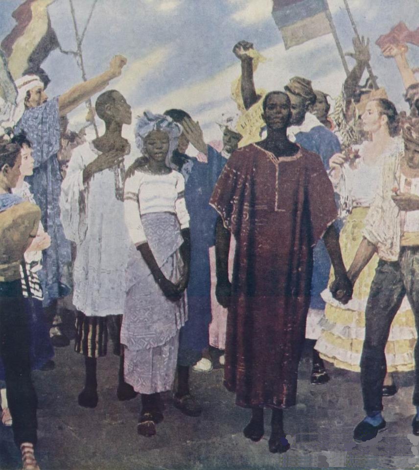 Мыльников. Пробуждение. 1957. Вам не кажется, что Мыльников как-то скептически относится к шедшей тогда деколонизации Африки? Естественно, нечего обращать внимания и на его слова о “Прощании”: "О чём она? О Родине, о матери, которая для меня неразделима с Родиной, о трудностях, которые выпали на долю, тяжкую долю моего народа в период Великой Отечественной войны. О неоплаченном долге перед нашими матерями, даровавшими нам жизнь, освятившими своей любовью” (Википедия). Настоящий художник всё выражает в своём произведении. 31 05.2022. ** - Это натяжка искусствоведа. Это не вот только начавшаяся война сделала таким страшным её лицо, а надрыв работы на земле при царе и после него, голод в 1921 и в 1932 годах, репрессии. Не война владеет чувствами матери и сына (младшенького, наверно), ибо оба они чуть не единственные, стоящие вертикально. На этой картине ещё вертикальны только столб и фабричная труба, помеченные мною синими вертикалями.