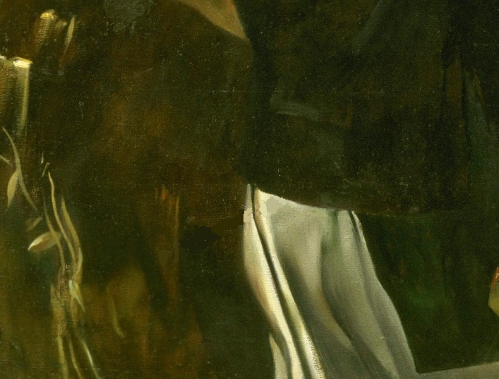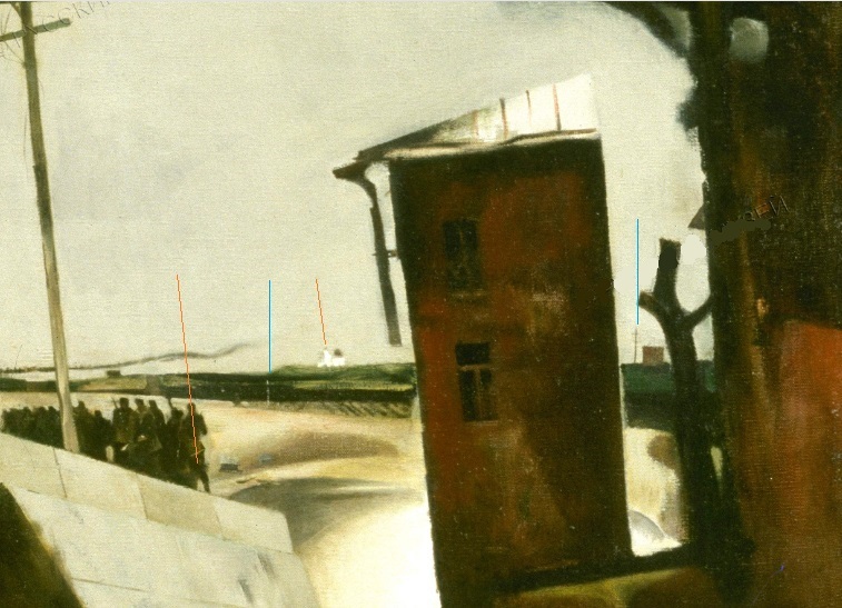 Даже церковь на горизонте наклонена, даже группа солдат наклонены. Весь мир накренился. Даже дальняя церковь. А что это справа, где фабричная труба и дом на горизонте? Это стекло открытого окна, отражающее, что попало (фабричную трубу и дом на горизонте и пруд, перед которым стоят солдаты)? Но где рама? Почему это стекло переходит в небо наверху, будто так стеклу и полагается.