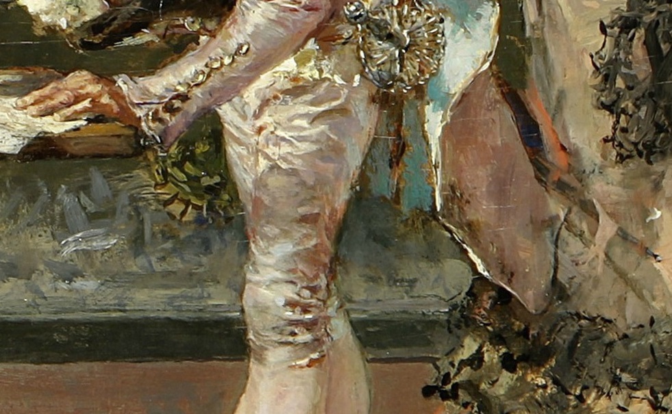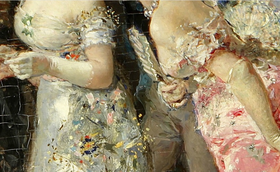 Фортуни. Испанская свадьба. 1868—1870. Фрагмент. "…лица одеты по моде XVIII века… Фортуни изображает шелк и кружево с исключительной точностью. Зритель почти слышит шелест тканей” (Википедия). Всё подано с прицелом на вещную исключительность, как у аристократов предыдущего века. Для хозяев жизни 19 века. – Мелко! Слава богу, что Репин-художник, в отличие от Репина-зрителя, был глубже. 6 июня 2022 г.