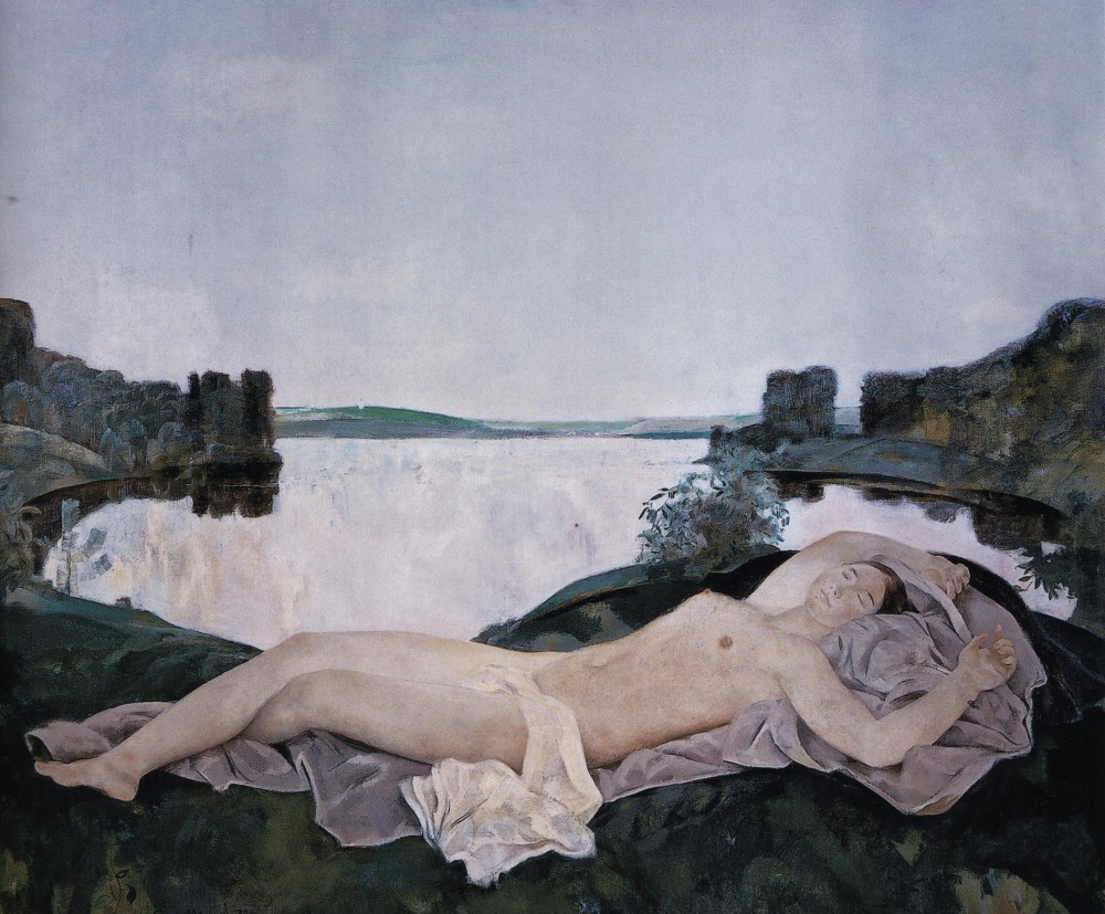 Мыльников. Утро. 1972. С такими словами: "Она [картина] строится на взаимодействии трех основных световых масс — чашеобразного пятна неба, овала зеркальной глади озера и обнаженной женской фигуры. Зеленые берега, обрамляющие озеро, тоже, сами по себе, являются довольно ясно читаемой чашеобразной формой. Возникает едва уловимый зрительный парадокс, игра формы и контрформы, объекта и окружающего пространства. Картина передает состояние утренней тишины и равновесия, хотя бы неустойчивого и временного, но еще присутствующего в этом неспокойном мире. Это — картина-медитация, картина-размышление о судьбе красоты, ее хрупкости и незащищенности. Несомненно, вдохновленный образами Джорджоне и Тициана, живописец вступает с ними в своеобразную полемику, ведет через века диалог со своим великими предшественниками, являя свой образ современной Венеры. Эта диалогичность подчеркнута зеркальным разворотом женской фигуры в картине Мыльникова. Также следует отметить иную роль пейзажа, где преобладание светлых масс воздуха и воды создает эффект растворения человека в природе, в противовес прочтению темы итальянским мастером, когда значительную часть полотна занимает земная твердь, что в некоторой степени материализует, утяжеляет изображение, отличающееся, помимо всего прочего, и более динамичной структурой. Смелость принятия советским мастером такого “вызова времени” говорит о том, что это для него — не постмодернистский эксперимент, не компиляция, не плагиат, а подтверждение исторической преемственности, верности избранного творческого пути”. Я прямым шрифтом выделил то, что считаю натяжками и неправдой: “Зеленые” никакие не зелёные, чуть не синие, мрачные и холодные; “неустойчивого и временного” – ничего такого нет, всё неподвижно и окончательно, вневременье; “советским” – никакой Мыльников не советский с 1955 года, а антисоветский художник. Диалог с Джорджоне и Тицианом действительно есть. Если идеал первого – гармония высокого и низкого (Высокое Возрождение), а второго – трагического героизма (Позднее Возрождение, вопреки всей победительности инквизиции в Венеции утверждающее победительность тела в борьбе с духом), и если оба идеала – оптимистичны, то им противоположный (этой холодностью тона, какой-то бескрасочностью) идеал малочувствия у Мыльникова смеётся над оптимистическими упованиями великих венецианцев. . Итожа анализ картин, Кудреватый опять, как и в начале статьи, невольно, как бы тенью, касается сути творчества Мыльникова – пробуддизма: "Совершенное владение живописными и композиционными средствами позволяло мастеру выходить на глубокие философские обобщения, претворять явления окружающего мира в емкие вневременные символы”. Этой тенью является слово "вневременные". Пробуддизм действительно выпадает из времени, так как является мироотношением экстремистским. Разочарование его носителя в действительности слишком велико, уносясь аж в иномирие некое. Вот у романтиков была знаменитая мировая скорбь. Так они удирали всего-навсего в свой прекрасный, мол, внутренний мир. А это не иномирие. Которое таки выходит именно "на глубокие” переживания, будучи малочувствием. . Но меня будоражит сказать нечто совсем-совсем неожиданное…