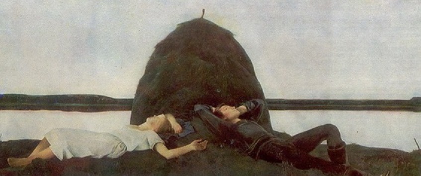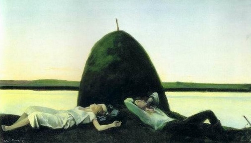 Мыльников. Тишина. 1987. Почему эта пара не касается друг друга? Потому что в СССР была официальная пуританская мораль. Лживая, как и многое-многое другое, начиная с, мол, социализма, начиная, с, мол, гражданской активности, с, мол, самоуправления. А про любовь: "Честность и правдивость, нравственная чистота, простота и скромность в общественной и личной жизни”. И художник тихо грустит о поверивших официальной пропаганде, как и он, наверно, когда-то. А год 1987-й. "Началом перестройки считают 1987 год, когда на январском пленуме ЦК КПСС перестройка была объявлена новым государственным курсом” (Википедия). И все было встряхнулись. А Мыльников знал наперёд, что на Этом свете спасение одно – отключиться от всего-всего, ибо нет* на Этом свете ничего хорошего. 7 июня 2022 г. * - Как же нет, если художник нарисовал, что есть.Сексуальным отношениям естественно не начинаться, пока нет убеждённости в любви. И именно такой момент созревания этой любви и изображён художником. А вы художника извратили. Он оптимист, а не пессимист. Он нарисовал хорошее в нереальном мире. То есть он пессимист в мире реальном. В чём нереальность? В ненатуральности отражения другого берега в воде. "Все светлые фрагменты, отраженные в воде, выглядят темнее. А тёмные участки — светлее” ( А тут – без изменения оттенка. Очертания отражаемого в воде не повторяются. Дом по горизонтали более вытянут влево, чем на отражении.