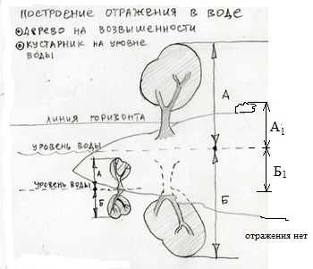 Можно сказать, что левый холм потому не отражён, что он дальше отстоит от воды, чем правый.