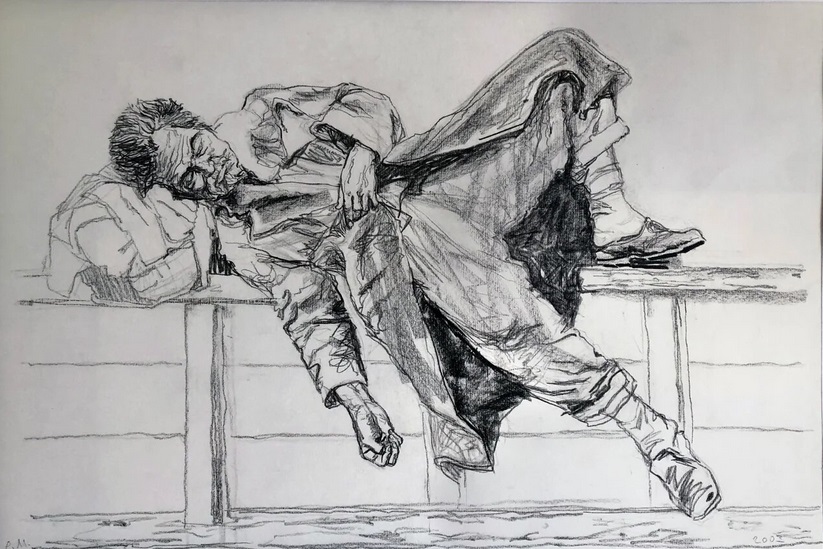 Раздобурдин. Лежащий. 2003. И я за Реиина обиделся. Репин картиной той открыл, что русский народ-то уже почти не верующий в Бога (чего никто не замечал), и что, собственно, скоро Россия станет страной атеистов (что является нецитируемым художественным смыслом, порождённым идеалом истины о социуме). И этюдами горбуна Репин просто искал одно из противочувствий, столкновением которых можно было б выразить этот нецитируемый художественный смысл. Лучшим оказался страстно верующий в Господа и в своё Им исцеление горбун. То есть ценность этюда в его подсобном характере для картины, художественный смысл которой скрыт (см. тут). А про вещь Раздобурдина пишут, как о самоценности: "В “Лежащем” (2003) Раздобурдин рисует нетрезвого спящего мужчину, по-видимому, без определенного места жительства, типичного представителя городских социальных низов. В расположении тела на горизонтальной поверхности (лавке, деревянном ящике?), в неряшливой позе со свешенными вниз рукой и ногой как бы показываются незащищенность и уязвимость этого social homo sapiens. Композиция рисунка достает из глубин нашей зрительной памяти похожие отрывочные сцены уличной жизни, свидетелями которых хотя бы однажды был каждый. Интерес художника к подобной теме вызывает сочувствие к больному и опустившемуся человеку, русское стремление разделить чужую боль как свою… Глядя на эту работу Раздобурдина, можно вспомнить репинского юношу “Горбуна” (перед тем, как поместить его в картину “Крестный ход в Курской губернии”, Репин сделал несколько графических рисунков и живописных этюдов с него)…” (https://cyberleninka.ru/article/n/obrazy-v-risunkah-i-ofortah-maksima-razdoburdina). Такое сближение обосновано “теоретически”: "Сегодня рисунок наравне со станковыми произведениями обладает самостоятельными художественными достоинствами, превратившись из рисованного подготовительного этюда, средства поиска раскрытия образа и темы в первоначальном наброске, обыденной зарисовке, в произведение графического искусства со своим языком. Когда художник воспринимает рисунок не как простое средство фиксации мимолетного впечатления от пейзажа или человека, а как средство создания образа, он использует весь богатейший арсенал графических материалов, обладающих широкими изобразительно-выразительными возможностями” (Там же). Я не уверен, что это верно. Потому что постановил себе художественным называть только рождённое подсознательным идеалом, а то, что рождено замыслом сознания, по-моему, имеет всего лишь эстетическую ценность (любая часть для целого). Сознание Репина назначало этюдам горбуна выражать то несчастье, то трагизм, то большую внутреннюю, то устремлённость. (Последнее Репин и взял в картину.) И все этюды имеют только эстетическую ценность, но не художественную. А дух оспариваемого высказывания разницы не видит. Хуже того. Меня не убеждает, что сознание (или подсознание) назначило руке Раздобудина выразить "русское стремление разделить чужую боль как свою”. Не голословно ли сказано? Откуда видно, что бомж нетрезв? – Из помрачения чего-то в мозгу, что должно б было заставить человека проснуться, раз правая нога упала? – Хорошо. Пусть он нетрезвый заснул. А откуда видно, что он бомж? Ничто ж на нём не порвано. Или человек, привыкший спать в кровати, не ляжет на какой-то ящик. У такого есть деньги, и он снимет место в гостини