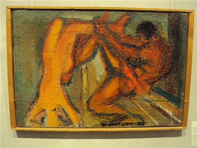 Арефьев. Прокруст. 1960-е годы. Холст, масло. "Для Арефьева Эрмитаж не был школой мастерства. Ленинградский художник учился здесь энергии искусства, динамике формы, весомости жеста. Неслучайно античность в исполнении Арефьева совсем не похожа на винкельмановскую аполлоническую — его “Прометеи” и “Прокруст” гораздо ближе дионисийскому античному духу Ницше” (Соколов). Слова-то какие шикарные: "энергии искусства, динамике формы, весомости жеста… дионисийскому античному духу Ницше”. Что дионисийский дух – это дух убийства греками бога в виде козла в первый день праздника-оргии, - об этом как-то молчат… Что это – дух вседозволенности и аморальности – тоже. Особое зло берёт, что Ницше тут не при чём, ибо тот – индивидуалист, а экспрессионизм Арефьева происходит из коллективизма. Безусловно, подсознательного характера, ибо то гиганстское, что я могу выудить для обоснования такого крайнего корёжения натуры, происходит не просто от “фэ” послевоенной действительности: "…был выстрадан самой жизнью, её дремучим, бедным, полным лишений бытом, людьми, пережившими страшную войну, голод, блокаду. После войны – нищета, расцвет уголовщины, драки, поножовщина, кражи, изнасилования, бандиты и шпана; и тут же инвалиды, люди, покалеченные физически и духовно, огрубелые, потерявшиеся, спивающиеся…” (https://arterritory.com/ru/vizualnoe_iskusstvo/recenzii/17471-iskusstvo_kak_sudba/). Беда была в другом – в том, что жизнь в СССР возвращается в своё обычное, бедное русло. Тогда как могло б начаться движение в постиндустриальное общество. С большой ролью масс интеллигенции. Чего страшно боялась партийная номенклатура. И переход в это общество оградила. А художники типа Арефьева, страшно далёкие от проблем научно-технической революции, тем не менее, каким-то сверхчутьём почувствовали начавшуюся новую беду в стране и завыли, - как почти 100 лет назад, - на экспрессионистский лад от ужаса, что бог коммунизма нас оставил. При чём тут Ницше? Только при том, что тот тоже взвыл 100 лет назад, но – от скуки-благополучия, а не от нищеты материальной и духовной, прорезавшейся как будущее советского народа. Прорезавшейся где? – В области материального прогресса ж! Я стал тогда на острие критики в своём заводском коллективе, будучи таким же далёким от проблемы, как сами художники-бунтари. – На комсомольском собрании технологического отдела завода я выступил против культа личности Хрущёва как автора при принятии новой формулы социализма: коммунизм есть советская власть плюс электрификация промышленности и химизация народного хозяйства. Я был против кампаний, организовываемых сверху. Я был за самоуправление снизу. Спецам внизу лучше знать, что нужно. – Я поставил свой вопрос на голосование. Я не дал его с голосования снять. Я оказался единственным, проголосовавшим против культа личности Хрущёва. Что вошло в протокол. Дошло до горкома комсомола. А там меня однокурсники знали как бунтаря ещё с института. И, как и прежде, чтоб не портить мне карьеру, опять спустили дело на тормозах. А я понял, что из комсомола надо валить. Но, если б меня угораздило выразить это умонастроение живописно, я б не расковался б так против натуроподобия, как я это разрешил себе как честный комсомолец. На моей стороне было молчаливое общественное мнение отдела технологов. Коммунисты же были не в чести, хоть тоже молчаливо. Я мог ра