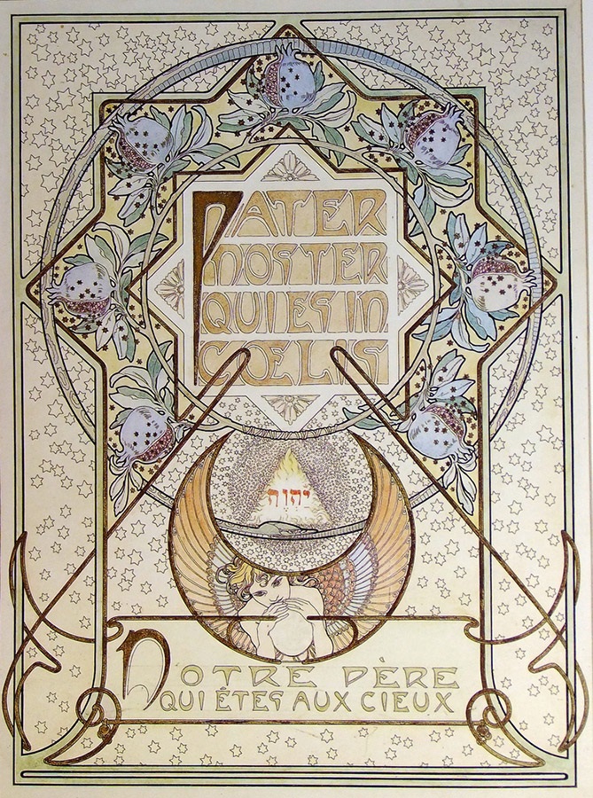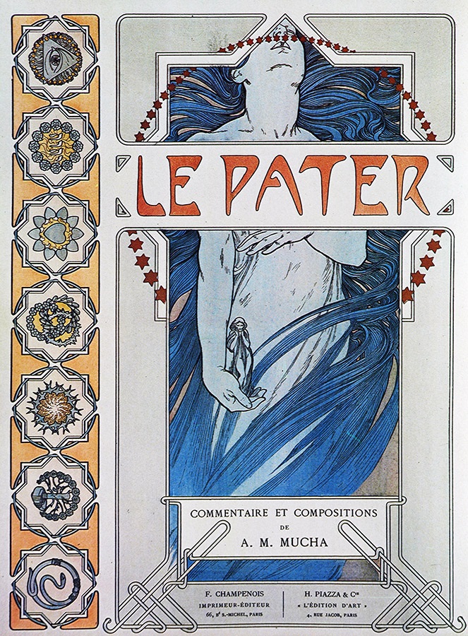 Муха. Отче наш. 1899. Это обложка книжки “Отче наш”. Изображён молящийся этою молитвою. Так согласитесь ли, что его тело какое-то мёртвое (голубого, а не телесного цвета, вялое и не модулированное тенями), а вот самое как бы неодушевлённое в этом теле, волосы (они растут и после отлёта души из умершего тела), какие-то живенькие (вьются, выделаны подробно)? Так тут прорвалось влияние подсознательного идеала иномирия. А есть сознание. Оно не знает, что сокровенное его хозяина антихристианское. И оно пытается как-то пристроиться к христианству. Это как Гумилёв, акмеист, ницшеанец (как, собственно, и творцы в стиле модерн), пишут, крестился на все церкви, мимо которых он проходил или проезжал. У них, крайне разочарованных, есть такая недоосознаваемая тяга – грешить особенно цинично. Вот в этом и состоит моя изворотливость: сознание не знает о наличии и проявлениях подсознательного идеала. Потому проявления эти и возможны. А что делает сознание? Во-первых, переиначивает смысл молитвы своим толкованием её, разбитой на семь частей. Первая: "Отче наш, сущий на небесах!” Вставлен такой изобразительный текст, включающий эти слова.