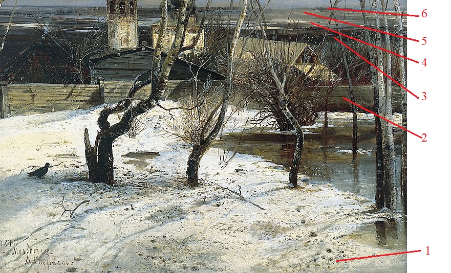 Саврасов. Грачи прилетели. 1871. Что я вычитал, сермяжно спросив, поисковик: “композиция "Грачи прилетели" Саврасова”? "За деревьями виден забор и деревянная церковь с колокольней, а дальше — бесконечные поля с уже разлившейся рекой, и простираются они до самого горизонта. Эта равнина придает картине ощущение бесконечности и пространственности. Чтобы усилить ощущение пространства, художник чуть изменил перспективу. Передний план выглядит так, будто художник писал картину находясь близко к земле.