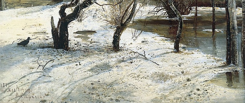 Но тогда горизонт был бы ниже, хотя на пейзаже находится по центру холста. Замысел художника был таков: он хотел, чтобы обратили внимание на дальний план, на равнину, которая играет в пейзаже немаловажно смысловую роль” (https://olga-dubova.ru/istoriya/savrasov-aleksej-grachi-prileteli-opisanie-kartiny-analiz-sochinenie.html). Зачем Саврасову понадобился такой выбрык композиции (давно, впрочем, известный, ещё с “Афинской школы” Рафаэля)? Про Рафаэля можно думать, что его подсознательный идеал гармонии низкого (обобщённый символ Аристотель) и высокого (обобщённый символ Платон) требовал равной внимательности к каждому представителю бесконечно отличающихся нюансов философий древности. Для чего надо было, чтоб они друг друга не заслонили. Что можно было сделать единственным образом. Чтоб ближние не заслонили собою дальних, надо было смотреть на ближних сверху, т.е. с высокой точки зрения (точки схода параллельных прямых, уходящих вдаль). Тогда из-за ближних оказывались, вверху над ними, дальние философы. Точка зрения на них могла теперь снижаться, и дальние как бы приближались для рассмотрения. Саврасов подобным образом поступил под влиянием сознательного замысла и подсознательного идеала. О чём говорил замысел? Прошло 10 лет со дня отмены крепостничества. Ничего хорошего от того, как отмена была произведена, не вышло. "В отечественной исторической науке традиционно выделяют три основных этапа в развитии революционного движения в России во второй половине XIX в.: а)1860-е гг. – создание революционно-демократической идеологии и первых тайных организаций радикалов” (https://interneturok.ru/lesson/istoriya-rossii/10-klass/rossiya-v-1855-1881-gg/obschestvennoe-dvizhenie-1860-1870-h-gg-konservativnoe-liberalnoe-revolyutsionnoe-napravleniya). Вот, подыгрывая этому движению, Саврасов и нарисовал старый-престарый снег, грязный, не сегодня-завтра исчезнущий. Для чего нужно было ему смотреть на ближний снег сверху вниз с высоты человеческого роста. Или лечь на снег и оттуда его рисовать. Но тогда любая кочка или ветка заслонила б ему даль. А та, со всем множеством её планов, была ему нужна по требованиям подсознательного идеала.