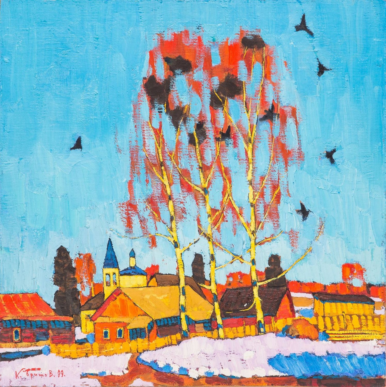Ким Бритов. Грачиная пора. 1995 г.” (Разноцветные грани). Казалось бы, сходится: и воспоминания, и грачи вот на самой картине на первом, можно сказать, плане, и какая-то церковка на втором. Можно блеснуть насчёт "улавливать в композиции”… Хоть не знаешь, положа руку на сердце, в чём собственно, композиция именно тут и чему она, такая-то, служит тут. – Это ж принято в этой области приятного балагурства около искусства: говорить мутно, малоответственно. Главное – чувство по поводу изливать и им заражать. Можно и вообще, в принципе, любыми словами пользоваться. Например, я для картины Бритова “Март. Гости приехали”. 1996 (см. тут) применил слова: "Гимн санно-лошадной России как символу традиционализма, то и дело выступающему на передний фронт Истории”. То есть горьковатую неизменность проакцентировал (как и Саврасов далью). А что наша безответственная около этой репродукции приписала? – "Бритов стремился уловить переменчивость состояний окружающего пейзажа…". – Прямо противоположное свойство. – Кто прав? – У неё и вопрос о точности слова не может возникнуть, раз о такой неточной сфере речь, как живопись. Главное – уметь связно и как-то другими словами повторить то, что другие написали об этом художнике. Главное – ляля. 28 июня 2022 г.