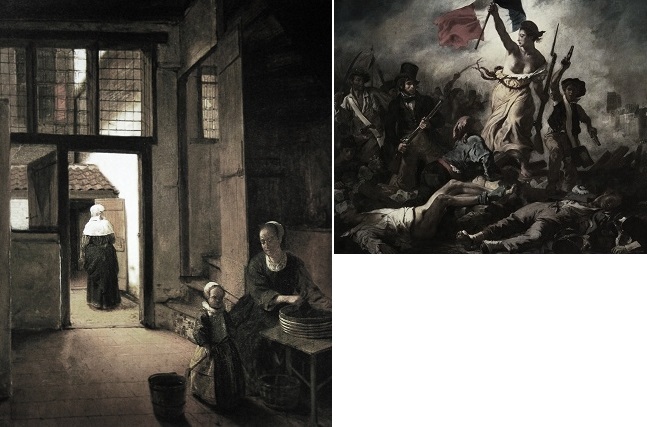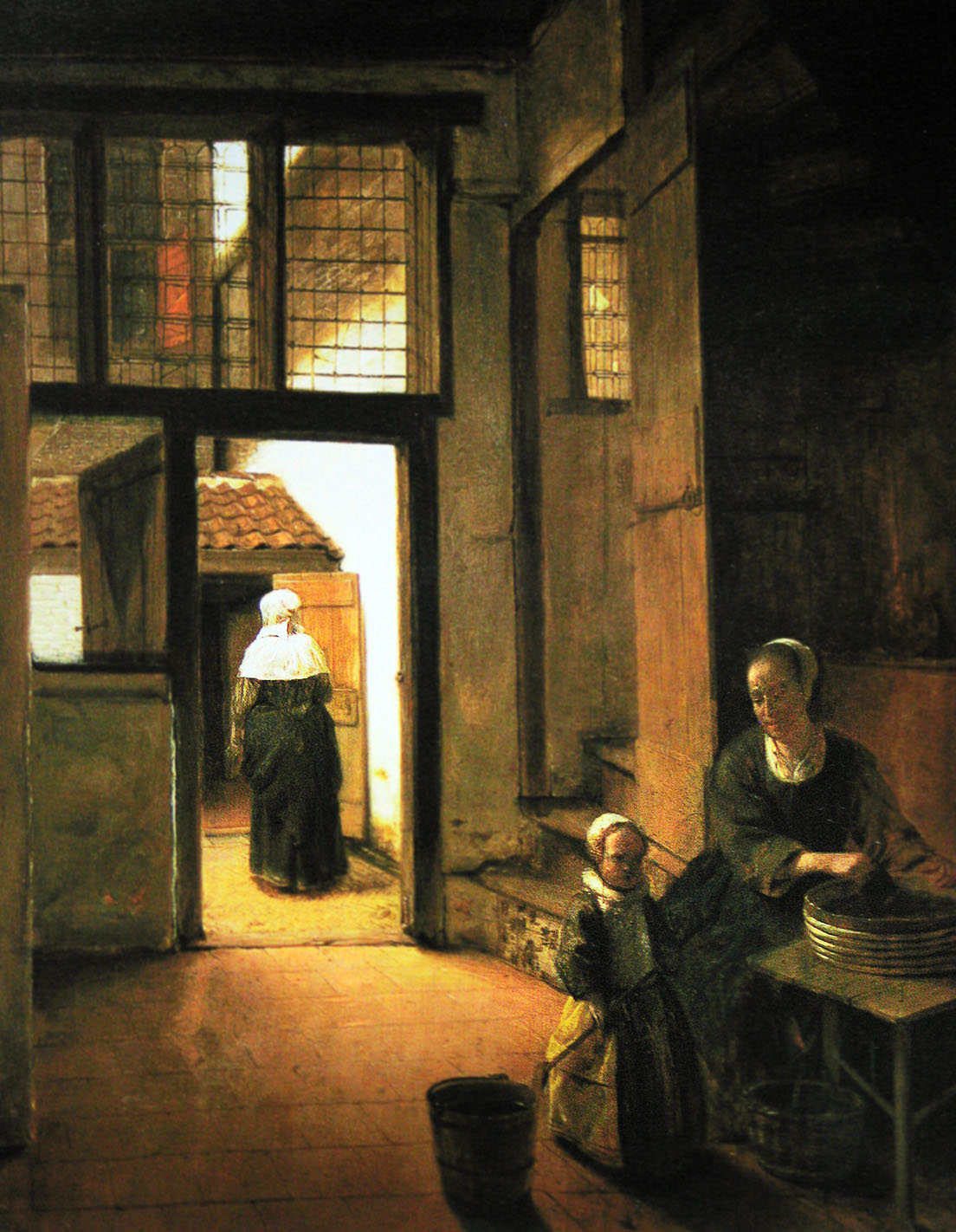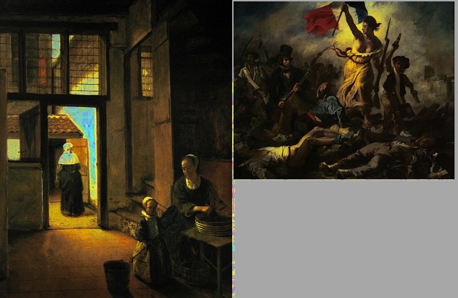 Я в программе GIMP2 в режиме инструмента “тон-насыщенность” привёл обе картинки до насыщенности минус 70%. Де Хох оказался в общем более светлым. При приведении освещения обеих до минус 70%