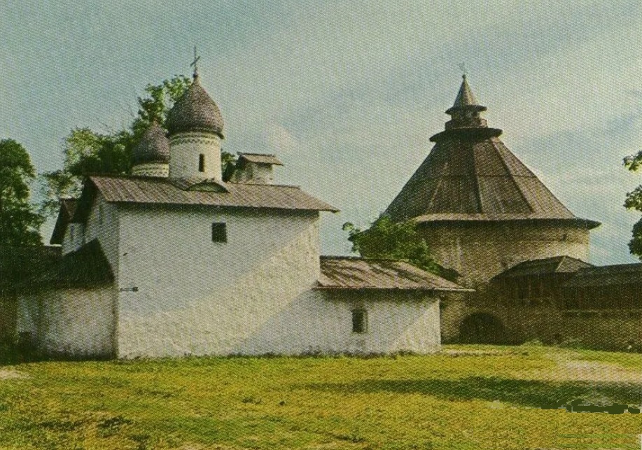 Стожаров. Псков. Покровская церковь и Покровская башня. 1969. Холст, масло. Груди тесно, дыхание спёрло… – Родина! Чую – в траве дело и в облаках. Я 40 лет прожил в километрах 350 южнее Пскова. – Тот же угол солнца днём летом. И такая же неожиданная бурьян-трава в центре города.