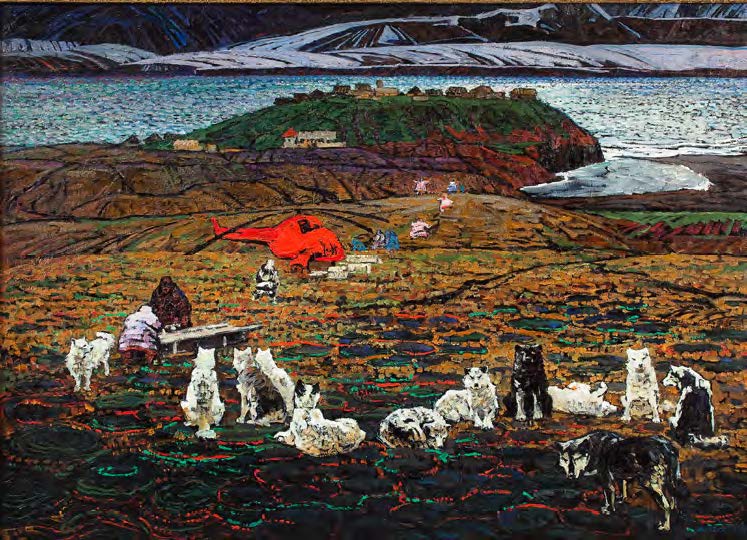 Вот. На втором плане какие-то чукчи, перед ними, спинами к нам, их ездовые собаки, на третьем плане залив, на четвёртом – горы другого берега. Шебеко, видно сознаёт, что это стыдно, не иметь в душе ЧЕГО-ТО, вечно какого-то одного и того же, что б требовало себя выразить, а что это – никаких слов не хватит, если попробовать. И ведёшь себя, как сомнамбула, всё-таки порываясь выразить это ЧТО-ТО. Нет, он такого счастья творческой муки лишён. Он имеет другое счастье – довольно легко находить, как выразить то настроение, какое владеет им в данную минуту. Находится в интернете только такое, тематически похожее: