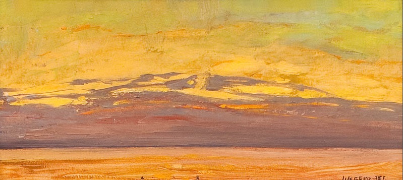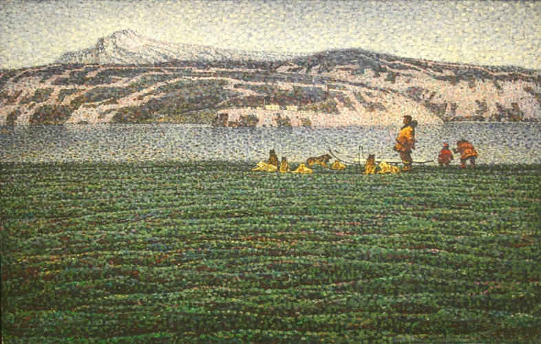 Шебеко. На краю земли русской. 1980. Время так называемого застоя, - подумал мельком. И стал проверять, последовательно ли – т.е. всюду ли – применён пуантилизм. – Оказалось, всюду (на траве первого плана точки в глаза не бросались). Что меня остановило? – Настроение. Какого-то огромного покоя. И тишины. Подумалось, не пробуддизм ли это. Какое-то смутное воспоминание забрезжило. (А я так много толкований делаю, что забываю их. Благо, в сайте моём есть поиск по сайту – можно в секунды проверить, не впервой ли мне из пуантилизма выводить пробуддизм.) Спрашиваю там: “пуантилизм буддизм”. – Так и есть. Выдало статью “Пуантилизм выражает буддизм". Про Сегантини. И про теоретический вывод этого у Флоренского. И про логичное движение из импрессионизма (как хвалы абы какой жизни) в пробуддизм, в малочувствие, если жизнь всё-таки становится всё хуже и хуже. Попал, значит. Здесь – какая-то Чукотка. С европейской точки зрения, из комфорта и цивилизации Чукотка совсем тихий ужас. Самим-то чукчам, их собакам, что на картине, всё, конечно, нормально. Всегда так жили – и сейчас так живут. В глуши. А время застоя, так называемого, распространяет апатию на всю страну. Интересно, какого года издания книга Флоренского? Мог ли Шебеко её читать в 1980 году? Вещь публиковалась: 1) Математическое образование. 1928. № 8, 2) Декоративное искусство СССР. 1982. № 1/290, 3) Флоренский Павел, свящ. Собрание сочинений. Т. 1. Статьи по искусству. Париж, 1985 и т.д. Шебеко родился в 1920 году, воевал, "В 1943 году поступил в Институт живописи, скульптуры и архитектуры имени И. Е. Репина в Ленинграде (обучался у известного художника Р. Р. Френца)” (Википедия). Связь Френца с Флоренским мною не найдена. – Мало вероятно, что Шебеко вычитал мысли Флоренского и их проиллюстрировал. – То есть вещь написана от души. Но не без осознавания опасности в СССР пробуддизм выражать – он в название бодрости нагнал, хоть времена в 1980-м были вегетарианские. Есть непонятность в картине: как по траве проехали сани? Разве что изморозью трава покрыта… "После 1980-х художник оставил тиражную графику, полностью посвятив себя живописи” (https://to-ros.info/?p=92365). Но пуантилизм в 1980-м это для него не новость.