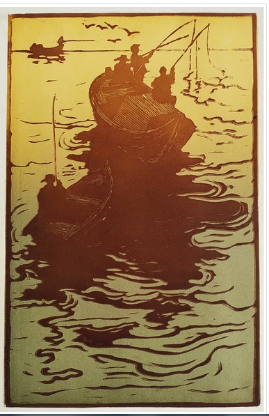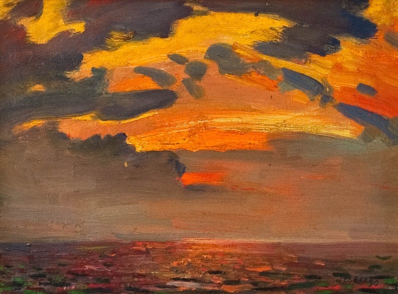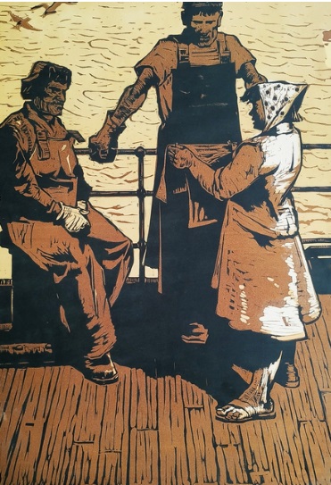 Шебеко. Вечер на море. 1990. Вот уже общественный строй вот-вот сменится. Эпоха перемен. – А впечатление, будто душа замерла и не хочет ничего, кроме неизменности, малочувствия. Но вопрос, как можно было параллельно заниматься вполне оптимистичными линогравюрами. "В 1970-х годах он увлекся эстампом. Это было отчасти данью веяниям времени: советская идеологическая машина, определившая искусство как одно из мощнейших средств воспитания, способствовала развитию всех его сфер. Эстамп в 1970-е был востребованным в силу высокого эстетического уровня и возможности широкого распространения (за счёт тиража). В творчестве Кирилла Шебеко в этом виде изобразительного искусства (большая часть работ выполнена в технике линогравюры) сразу определились темы – военно-морского флота и рыбацкой профессии. В листах большого формата отражены специфика боевого дежурства отряда военных кораблей, мужественные лица моряков-тихоокеанцев, труд рыбаков” (Там же).