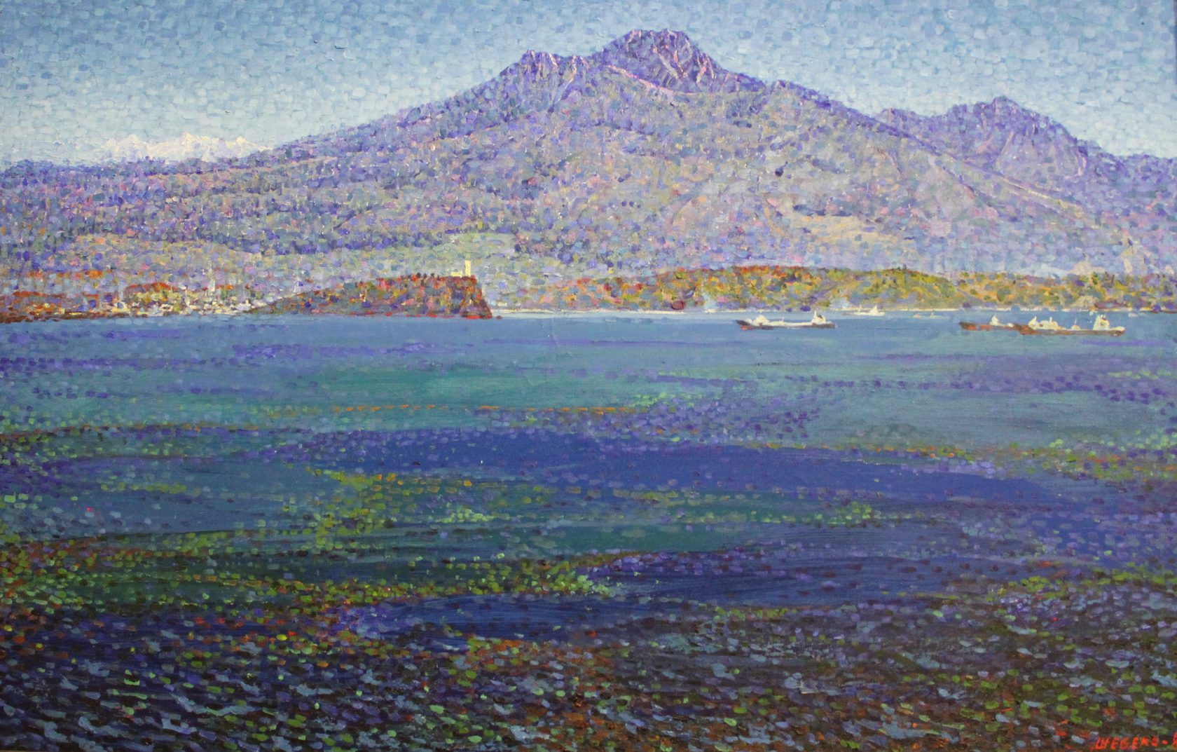 Шебеко. Курилы русская земля. 1985. В общем, нич-чего логичного не вытанцовывается. 6 мая 2022 г. * - Я, кажется, понял, почему “Курилы русская земля” не создаёт впечатления пробуддизма. Оказалось достаточным перечитать цитаты из Флоренского в статье “Пуантилизм выражает буддизм". В этих “Курилах” чувствуется глубина пространства.Меньше всего глубина чувствуется в картине “Бухта Находка”. Ведь интенсивность серых точек на дальних горах, на ближнем откосе и на среднем по дали холме, что между ближним откосом и дальними горами совершенно одинакова. Даже на совсем первом плане, воде, можно найти серые точки точно такой же интенсивности. Точная аналогия этому слова Флоренского: "неподвижность ведет за собою, как хорошо известно, оцепенелость не только тела, но и сознания”. То же в картине “На краю земли русской” с интенсивностью серых пятен в небе, в дальней горе и в дальнем береге у воды. А чуть большая всё же глубина получается из-за всё же разницы диаметра пятен: на небе диаметр самый большой. Пятна на воде и пятна на траве совсем не отличаются по интенсивности цвета и по диаметру. Итог: и то и другое кажется плоским, разрушающим глубину. Ту же роль разрушения глубины играет одинаковая желтизна неба и воды в наброске “Золотое море” и одинаковость тона большей части туч в наброске “Вечер на море”. – И пуантилизма не потребовалось. И совсем не так в “Курилы русская земля”. Голубые пятна в небе гораздо бледнее их же на горе. Желтоватый берег вообще линией отграничен от горы. Остров за счёт более тёмных синих пятен, чем синие пятна на берегу, резко приближается относительно берега. Следующий по близи к нам план, план далёкой воды, вообще лишён пятен. Что его от более дальнего плана тоже отодвигает. Ту же роль играет разноцветность воды по мере приближения к нам. А пятна на первом плане самые большие по диаметру. Что означает близь. В общем, глубина пространств бьёт по глазам. Какая ж тут "оцепенелость” взгляда. – Вот и испарилось малочувствие как цель выражения изображением. Какое настроение у художника, то он и выражает. А настроение – явление осознаваемое. То есть всё в Шебеко становится цельным, если считать, что он не ставил себе целью выражать ЧТО-ТО, словами невыразимое, т.е. писать произведения неприкладного искусства, претендующего на большую значимость. Ему хватает и прикладного – выражать настроения. Каждый раз – другое, если случится, что оно другое. 13.05.2022.