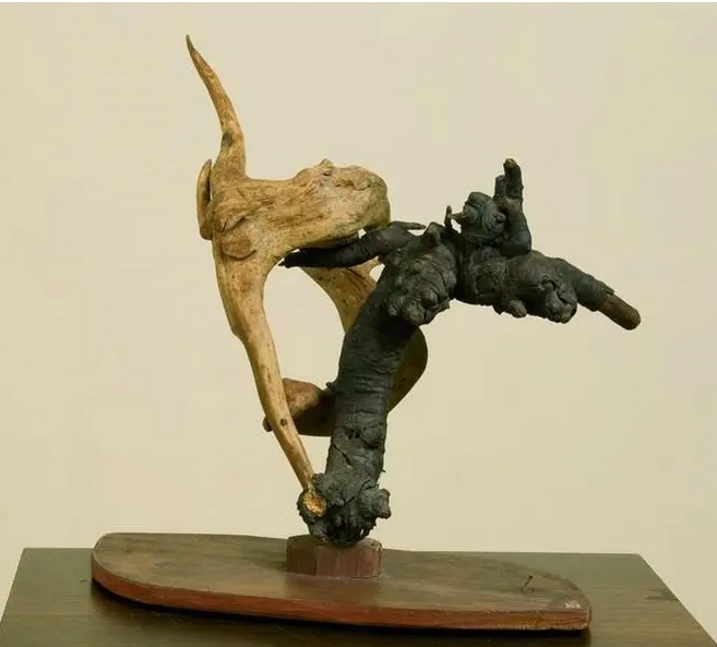 Сходится! Большой радостью для меня, одиноко скитающемуся по искусствоведению, является возможность новое для меня и совершенно неожиданное произведение знакомого автора свести, грубо говоря, к той же точке на Синусоиде Изменения Идеалов (СИИ), что и ранее разбиравшееся. Просто говоря, увидеть, что подсознательный идеал, какой его вдохновлял прежде, в новом для меня произведении тот же. Вот для так называемого фиолетового импрессионизма Матюшина такой точкой на СИИ оказалась (см. тут) точка перед верхним перегибом СИИ (движение – слева направо). Она у меня символизирует тип идеала трагического героизма. Не то, чтоб я помнил о Матюшине то, что написал выше. Я так много пишу, что не запоминаю, если буквально, что написал. Но что-то остаётся в памяти… И вдруг я сегодня читаю такие слова: "Авангардист Михаил Матюшин в 1920-е годы собирал лесные коряги* и, монтируя их на постамент, придавал им статус природных реди-мейдов [стиль такой – “готовая вещь” {не сделанная художником}]. Он никогда не пытался разглядеть в них подобие — название одной из работ, “Свободное движение”, говорит о том, что его интересовала пластическая конфигурация корней, застывшая детерминированность органического роста” (Александра Новоженова).