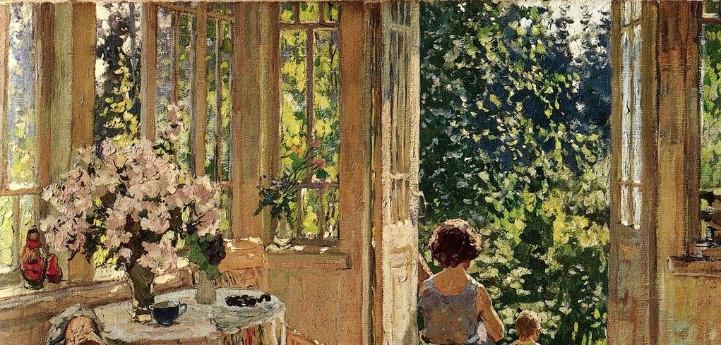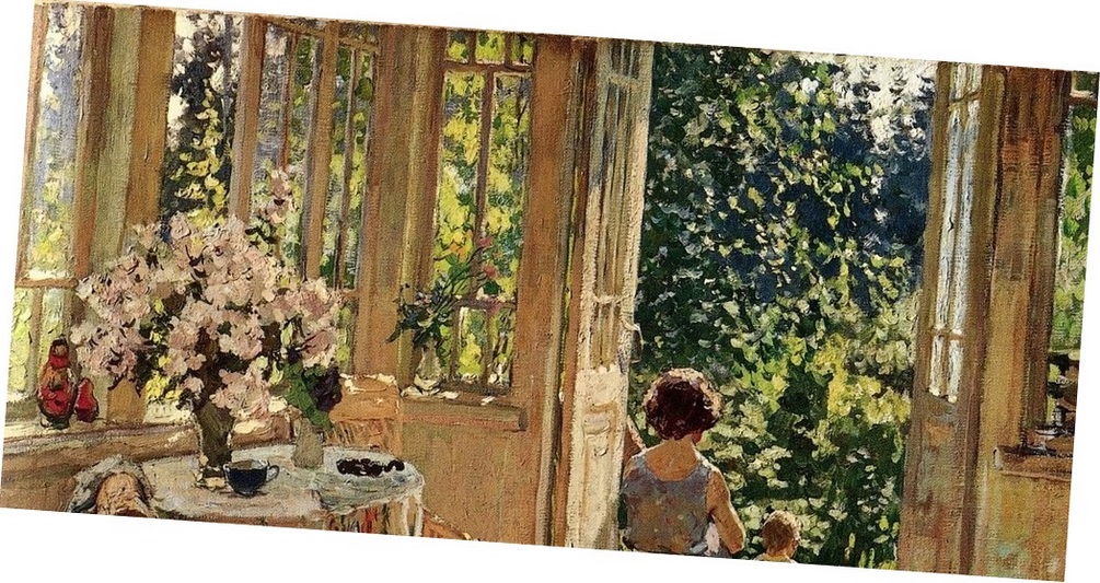 И. Попов. Июль. 1976. Сперва моё вглядывание повело меня не туда. Я задался вопросом, что это за палки в руках мамы и её дочки. Не играют ли они в ужение рыбы в пруду? А потом я обратил внимание на очень вспученную масляную краску, какою покрашена дверь. Особенно вверху. Это не дача. За которой, естественно, уход плохой. – Если это дача, то, судя по журнальному столику, отсутствию хозяйственных вещей, дача принадлежит кому-то именитому (хозяйственные вещи лежат не в месте приёма гостей, каковым является веранда); но именитый не довёл бы краску двери до такого вспученного состояния. Значит, это не дача, а дом, в котором живут всегда. Дом хиреет. Мужа, наверно, нет. Отсюда такая дверь. А потом я в одном месте вычитал о "покосившемся столике”. – Глядь – правда*. – Почему я соглашаюсь? – Чую спиной. Заваливается он к стенке. Потому к ней и придвинут. Некому починить. Главное же… Я вспомнил, как я при случае (оказался в Питере) пошёл в Эрмитаж в рубенсовский зал проверять, действительно ли в рубенсовских апофеозах красный цвет… не тревожный по Фромантену. (Это противоречие, кстати, порождает катарсис “соединение несоединимого”, что составляет формулу идеостился барокко по Якимовичу.) Попутно я обратил внимание, что в Бельгии тогда в натюрмортах цветы были, а в Голландии – нет. – Примерно так.