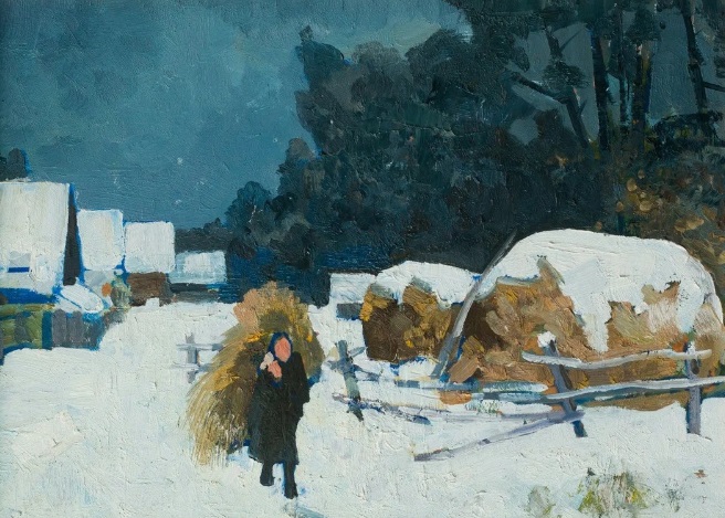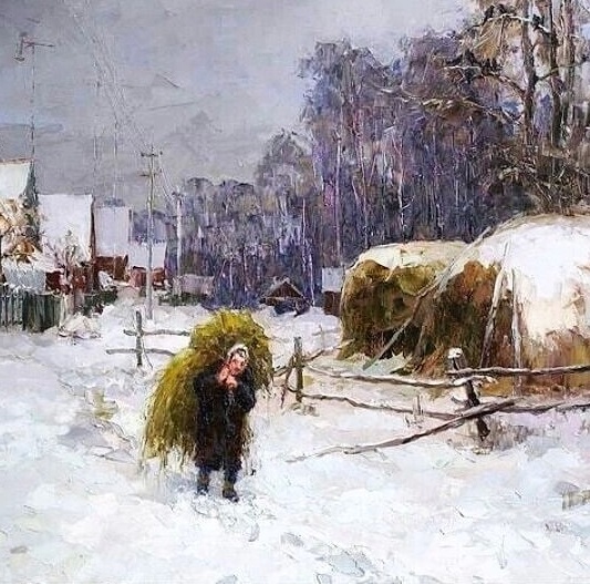 Умер Степанов в 1923 году. Тогда не могло быть таких электропроводов на столбах. Поиск по этой уже картинке, кто её автор, ничего не дал. Ясно только, что текст автора канала никак не объясняет, почему Ишкову нужно было лишить женщину лица. Так это я, признаюсь, отвлёкся от того, что делал в самом начале после прочтения процитированного объяснения. В самом начале, я просто прочёл немного дальше после точки: "А вот полотно “Моя деревня” со сходной тематикой, но тема его — совершенно иная. И тут же меняется техника, строй композиции, отношение к комплементарности цвета, ритмы и так далее. И вроде бы тоже зима, и в центре — опять женский образ, и вновь на плечах — “целевая нагрузка”, а фоном — сельский пейзаж. Однако, благодаря совершенно иному подходу, мы видим уже не метафору одинокого (пусть и мирного) угасания, а праздник жизни, полный светлых надежд. Согласитесь, дорогой наш читатель: нетрудно решить, что эти картины принадлежат авторству разных художников. Но нет. Сменилась не рука, владевшая кистью, а идея, водившая рукою!”