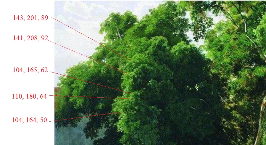 Числа слева направо: красного, зелёного, синего. Хм. Нет, вроде, локальности. Или надо было определиться с допустимым разбросом величин… Выше там написано: "Это ещё робкие, грубоватые ученические работы, свидетельствующие о его поисках и увлечениях… ясно говорят о традиции венецианской школы с её интересом к… солнечному свету, мелочному натуралистическому выписыванию деталей, согретому мягким лиризмом и сентиментальной любовью к изображаемым предметам”. Что такое венецианская школа? "…фотографическая точность… графичность в соединении с особенным чувством глубины изобразительного пространства… В конце XVIII века венецианская школа исчезла” (Википедия). Каналетто… Мне очень нравился. Ясно. Как живое ж! Вся академичность, собственно, возникла для услаждения победителей в жизни. А это, обычно, всё более и более в 19 веке низменные люди. – То, что было совершенно неуместно для передвижничества. Васильев же был побочным сыном какого-то очень большого человека, и передвижники его любили за талант, закрывая глаза на его аристократические-де замашки. Но, пока, вижу, он самовыражался вполне органически. Да и потом он с передвижниками, этими плачущими о народе, не слился. В нём стал прорезаться настоящий реалист. Но это я понял в старости. А в молодости я заплакал перед его картиной “Мокрый луг” (1872). Дело было так. Я проезжал через Москву и пошёл в Третьяковскую галерею. А она долго была закрыта на ремонт, и вот только открылась. В ней сделали в некоторых залах раньше не бывший верхний свет. И вот, когда я вошёл в зал, где висел Васильев, разошлись облака, и глянуло солнце в это верхнее окно. Я же глянул на траву этого “Мокрого луга”, а она так вспыхнула как бы навстречу этому солнцу, это было настолько, как живое, что я прослезился. – Как живое – признак дурного вкуса. В картине тоже переменчивый свет. Солнце там и сям прорывается сквозь мчащиеся тучи. – Судя по наклонённости макушек облаков налево, ветер их гонит справа налево. Дождь, если и прошёл (мокрый же луг), то сейчас хлынет ещё сильнее. Прямо чернота идёт справа. А раз чернота… Передвижники его к себе всё же как-то обратили. Это образ реакции, которая наступит после пика революционного движения. Это чуяние того в социуме, что ещё никто не чует. Мне б от этого слезу пустить: от предвидения Васильева… Но от реализма в слезу не тянет. Он чуть ли не аморальный в своём вЕдении. Я же тогда делал только первые шаги в самостоятельном подходе к картинам. Дурновкусие (“как живое”) во мне ещё бушевало. И я сумел какой-то живой цвет травы на картине связать с выглянувшим на улице солнышком, а не с тем, к чему дело шло в картине у Васильева. Зато теперь я к ней (к репродукции) подошёл как паталогоанатом. Вдруг, думаю, он чем-то ещё, кроме черноты, наступящей скоро справа (само “справа” – символично), выдал? Мне был подозрителен сильный свет от отражения неба в воде. Он казался самым светлым местом в картине. Я это проверил сведением освещённости в графической программе до нуля.