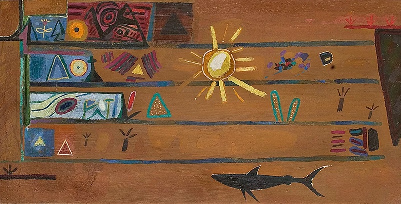 Овчинников. Символы. 1991. Оргалит, масло. И как её чутьё, словесно оформленное совершенно непонятным образом, перевести в слова, понимаемые обычным человеком? Я схватился за её фразу: "…у Овчинникова символы-пиктограммы внедрены в слои полуабстрактной живописи и приходят к нам как знаки древнего палимпсеста – “знаки сокрытия”…” (Там же). Палимпест – "в древности так обозначалась рукопись, написанная на пергаменте, уже бывшем в подобном употреблении. Позже это понятие было распространено и на наскальные росписи первобытного искусства, когда на стенах с полустершимися от времени росписями наносили новые изображения” (Википедия). Мало того, что прежние письмена смыты, так новые, поверх написанные, тоже мешают прочесть, что было сначала. Так я знаю подходящие, закопанные далеко, слова Ницше: "…всё материальное — это своего рода движение, служащее симптомом какого-то неизвестного процесса: всё сознательное и чувствуемое — это опять-таки симптом неизвестного” (Ницше Ф. Полное собр. соч.: В 13 томах. Т. 12. С. 24). Если счесть, что есть тонкошкурые люди, до последней степени не переносящие Неизвестное в Этом мире, из-за чего им подсознательно хочется бежать из Него в метафизическое иномирие, то Овчинников – из них. Тем паче, что он родился в Казахстане, а там полно петроглифов. Как искусствовед почуяла трагизм в знаках сокрытия и соотнесла это с трагизмом, приводящим к абсурду, я не знаю. Но – факт. Она эту вещь Овчинникова вставила в свою статью. 15 ноября 2022 г.