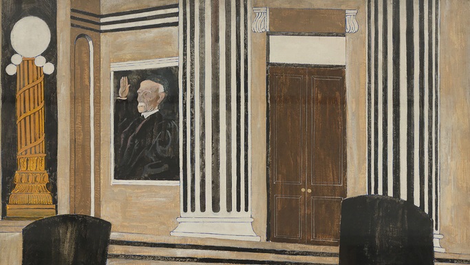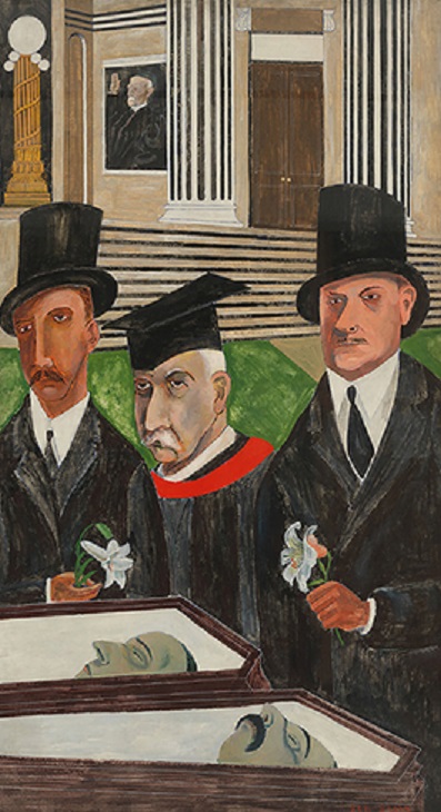 Бен Шан. Страсти Сакко и Ванцетти. 1931-32. Холст, наклеенный на доску, темпера, гуашь. Бедняки Сакко и Ванцетти были политически активны на фоне забастовок. Их арестовали как якобы грабителей и убийц, а свидетельств, опровергающих это, суд не принял во внимание, так как, мол, свидетели покрывали преступников по национальному признаку (все итальянцы). Неправо пересмотревшие дело сатирически представлены стоящими за гробами невинно убиенных. А один показан в виде портрета присягающим перед…