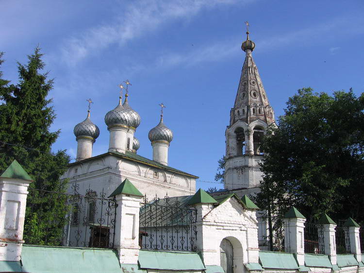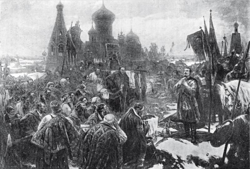 Вещилов. Иоанн Грозный после казанских побед. 1904. Так же, за научную основательность, наверно ценили и в Академии. За вот эту картину он "получил звание художника и право пенсионерской поездки за границу” (https://vk.com/@macternashylke-veschilov-konstantin-aleksandrovich-18771945). По-видимому, изображено, как "после разгрома Казанского ханства часть татар (преимущественно знатных) перешла на службу к русскому царю и получила некоторые привилегии в торговле. Иван Грозный пожаловал татарам владения в г. Романове (ныне Тутаев Ярославской области) на Волге, а впоследствии упорствовавших в исламе татар переселили оттуда в Кострому, где, по-видимому, уже существовала небольшая татарская диаспора” (https://www.facebook.com/Kostroma/posts/317809861692643/). В Костроме есть похожая церковь – Церковь Святого Апостола и Евангелиста Иоанна Богослова.