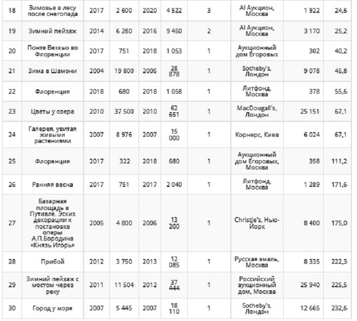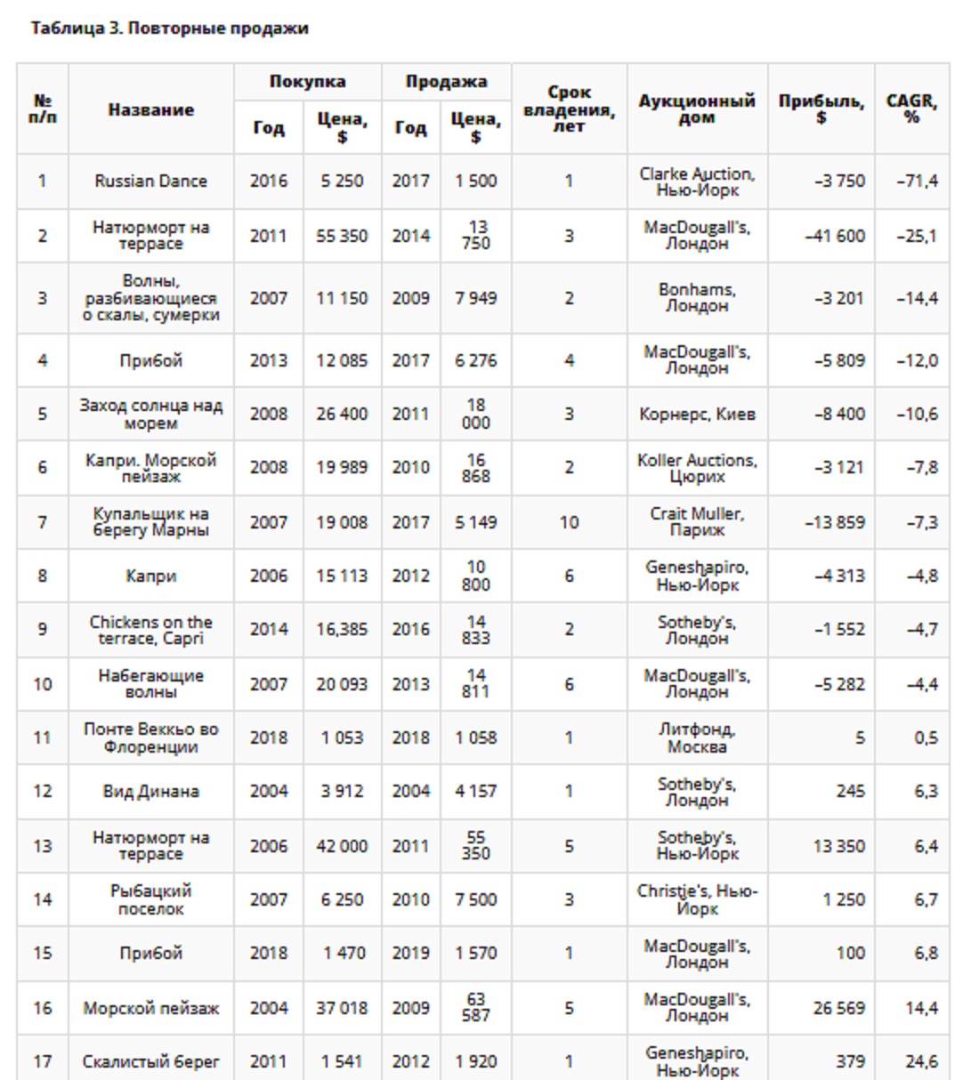 Работы Константина Вещилова имеют 30 повторных продаж — серьезный результат для русского художника, с таким же высоким положительным среднегодовым темпом роста стоимости (CAGR) — 45,6 %. Если посмотреть на период владения работами художника (срок между двумя продажами), имеющими в итоге положительный CAGR, он будет в среднем равен полутора годам. Тогда как сделки, принесшие владельцу работ Вещилова убыток, разделяет в среднем четыре года. Отметим, что среди успешных продаж также находятся все работы, приобретенные ранее до $1 тыс. Средний эстимейт всех проданных работ художника был превышен на 132 % – другими словами, продавцы в среднем получили сумму на треть больше первоначальной оценки аукционного дома. Превышение верхней границы эстимейта зафиксировано при 32 % продаж. Складывается впечатление, что все успешные (по итогу) обладатели работ Константина Вещилова знали, когда покупать и когда продавать — об этом говорит спекулятивный характер сделок, часто проведенных через один аукционных дом или в пределах одного года. А те владельцы, которым повезло меньше, метались между странами и аукционными домами и зачастую руководствовались распространенным принципом “работа есть — отчего не продать”. В итоге угадать не получалось ни с тем, ни с другим. Для авторов, имеющих более 100 аукционных продаж, на волатильном рынке (в т.ч. и российском) очень важно смотреть разрыв между топ-продажей и, скажем, десятой по счету. У большинства авторов этот разрыв составляет более 100 %, другими словами, есть некая “общая масса” работ и несколько намеренно спекулятивных сделок, совершенно не отражающих рынка, но сделанных с целью подогреть интерес и улучшить общую статистику художника. Порой подобный разрыв наблюдается даже в первой тройке аукционных продаж. Вещилов на этом фоне — редкое исключение: самая дорогая его работа была продана за $122 830, десятая сверху — за $74 328 (62 % топ-стоимости), двадцатая — за $48 404 (64 % стоимости 10-го места в рейтинге). Приведенные ценовые показатели, а также то, что 20 топ-продаж художника разбросаны по времени на 16 лет, а не сконцентрированы вокруг определенного периода “моды на художника”, вместе говорят о том, что рынок Константина Вещилова сбалансирован. Однако любой баланс нуждается в поддержке: для активизации положительной ценовой динамики сегодня художнику не хватает персональной выставки в ведущем российском музее, а также планомерной работы частных коллекционеров по его продвижению. Объединят ли усилия текущие владельцы работ или те, кто приобретет Вещилова в ближайшее время, увидим в недалеком будущем. На текущем, 347-м AI Аукционе выставлен “Морской пейзаж” (конец 1930-х — 1940-е). Патриция Семенюк Денис Белькевич” (https://artinvestment.ru/invest/artistofweek/20200914_veschilov_artist.html). 25 ноября 2022 г.