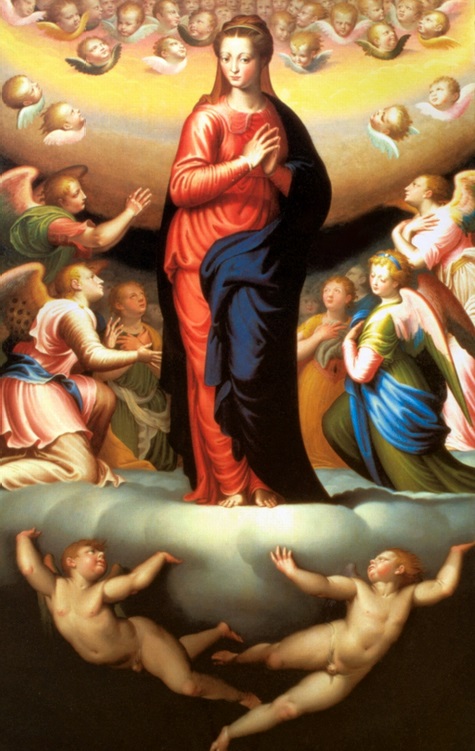 Кампи. Мадонна во славе. Какие неприятно упитанные ангелочки. У всех преувеличенные жесты. Мадонна лицом повёрнута вправо, глаза смотрят прямо, плечи развёрнуты влево, ступни – прямо. Ангелесса с голубой лентой в волосах как повывернута. На картине Ангуиссолы Кампи как закручен: нам видна его спина (так круто он повёрнут влево, лицо повёрнуто круто вправо, глаза – туда же ещё больше. Насмехаясь над его аскетизмом, художница сделала его почти лапающим грудь изображения, а то первоначально защищалось левой рукой. Но главное, она его сделала реальным человеком, а не витающим в эмпиреях пафосным творцом во имя морали. Ибо саму её тянуло на землю, в какой-то реализм, что ли.