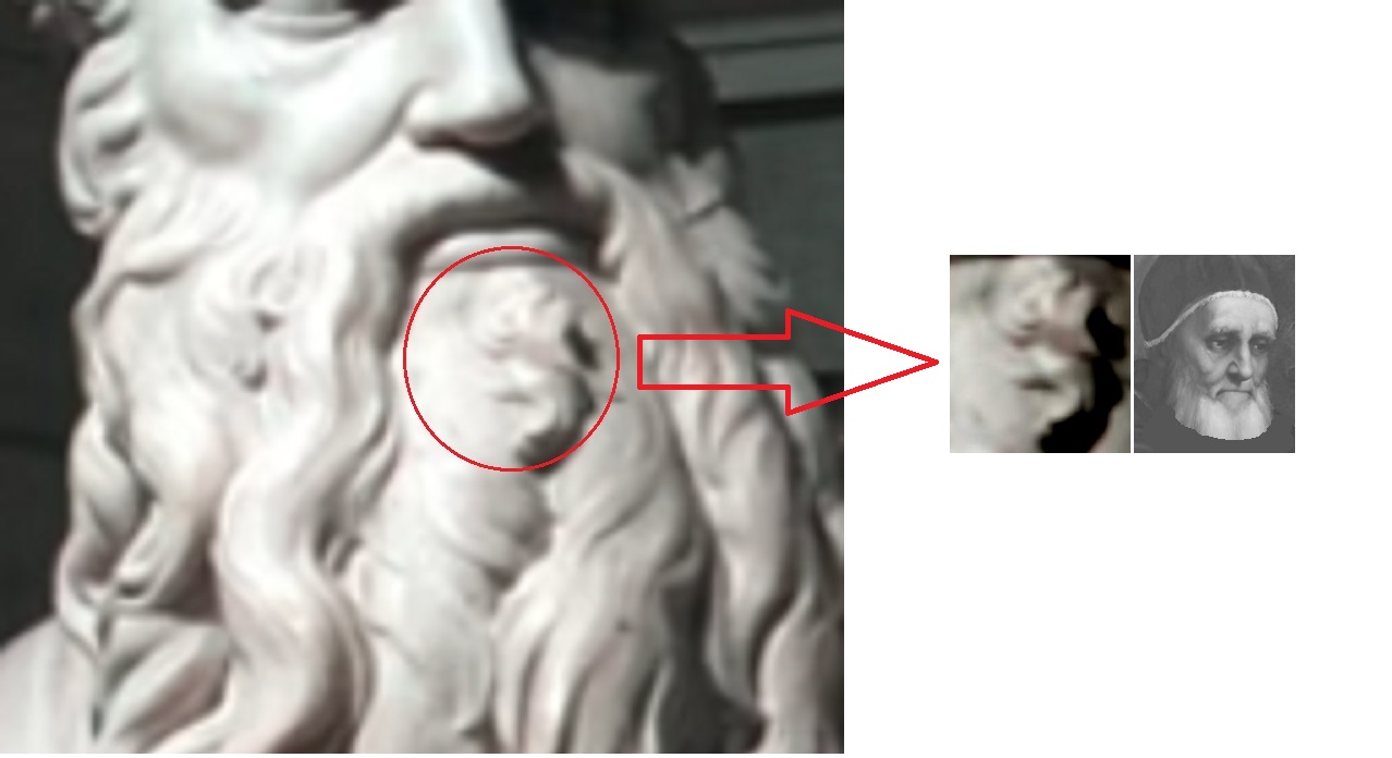 В истории искусства есть сенсационная новинка . В бороде Моисея Микеланджело итальянский искусствовед нашел портрет папы Юлия II <…> Казалось, что об этой статуе нельзя было сказать ничего нового, когда выдающийся священник Ватикана и искусствовед Дон Джузеппе Паррони, во время учебы в Сан-Пьетро-ин-Винколи в дождливый и полутемный день, понял это.