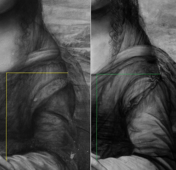 Фрагмент предварительного рисунка двух работ (слева. Джоконда (©Elsa Lambert, C2RMF)/ справа. Джоконда (копия)). (Если это не подделка автора публикации, можете сами проверить: жёлтые вертикаль и горизонталь равны зелёным.) Более того, правки изображённого одинаковые. Применяемые краски одинаковые. – С ума сойти! Леонардо и кто-то из его учеников писали два портрета одновременно. Это лишь через 507 лет обнаружили потому, что в копии кто-то когда-то очень затемнил фон портрета, а сняли его только сейчас. И занялись. (А чтоб до меня дошло, ещё 13 лет понадобилось.) Параллельно я прочёл, что, мол, из-за особенностей периферийного зрения, когда смотришь в глаза портрета, кажется, что губы улыбаются, а когда опускаешь взгляд на губы, улыбка пропадает.
