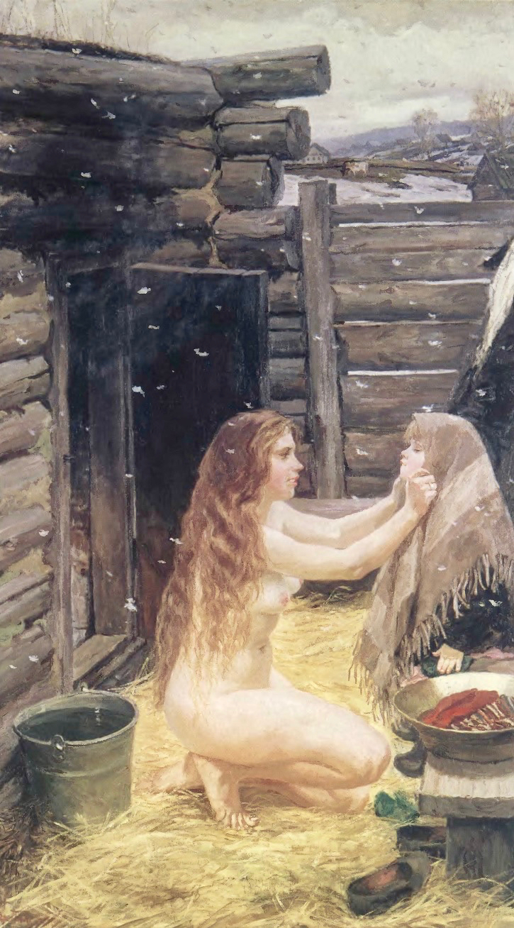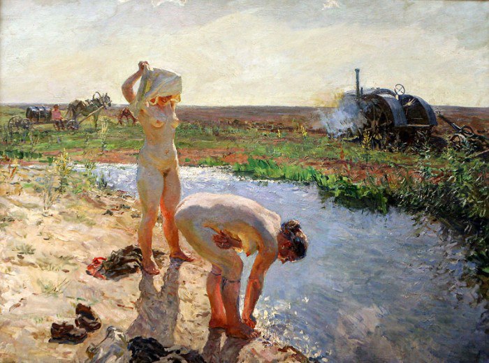 Пластов. Весна. 1954. И, кто меня знает, знает, что для меня дата создания картины очень много значит, потому что я от неё ожидаю подсказки, какой дух времени мог выразить художник. И для меня важно время замысла – 1944-й. Для меня 1944-й многозначительный: я стал сиротой (война если не прямо – отец был белобилетчик по болезни – то косвенно его убила: поехал в командировку в район эпидемии тифа). Это одно. Другое – мама в этот же год вернулась из эвакуации в только что освобождённый от немцев наш город. Как она осмелилась? – Видно, вся страна поняла, что победа не за горами. Кормильца потеряла. Она ретушёр – в Кермине, может, и фотографии не было, чтоб там устроиться. А дома фотография была до войны. Вот и поехала. И Пластов понял, что скоро войне конец. И… Подумал, наверно, что теперь не только войне конец, но и тому колоссальному напряжению всей страны с 1929 года начиная. Конец напряжению беспрецедентной в истории мира модернизации и войны. И скоро можно будет вздохнуть облегчённо. Пластов же не мог знать про атомную бомбу и про продолжение колоссального напряжения страны после войны, чтоб опять спастись. И, учитывая это неведение, ослепительность чресл + серая отсталость “курной” деревенской бани, топящейся “по чёрному”, что возбуждают в зрителе? То, что приходит в голову мне, может, только мне и может прийти в голову. Я чуть не умер годовалым и рос хиляком. Первенство в чём-то физическом – это было не для меня. Потому я пацанам со двора предложил играть не в простые пятнашки, а чтоб бегать пришлось по начерченному лабиринту с тупиками. Так у меня был шанс удрать (или догнать). Пацаны соглашались, не зная подоплёки моего предложения. – Вот такому мне и приходило в голову, что первобытный-то коммунизм кончился, как только кончилась крайняя ограниченность съестного, как только появились излишки. То есть с тех пор мыслимо было вернуться к коммунизму, если только договориться о равенстве в потреблении, то есть во все времена, когда сменяли друг друга эксплуататорские строи. Но вот в СССР рванулись к Справедливости, как никогда до сих пор. Наступил строй для слабых, так сказать. Естественно, что у меня, слабого, и возникла в голове утопия. О хворях и болезнях Платова ничего не известно. Известно, правда, что он чуть было не стал священником. Революция помешала. Зато само христианство имеет некое сходство с коммунизмом. И это даёт мне право не от своего имени, а от имени его подсознательного идеала сказать, что катарсис, рождённый столкновением ослепительности чресл и серой отсталости “курной” деревенской бани, это – вообще говоря – избавление от напряжения модернизации, длившегося в стране уже два десятилетия. А иначе – как бы идеал возвращения в мифический золотой век человечества. Как бы возвращение в коммунизм, какой был с самого начала. Не в тот, марксов, который опередит, мол, капитализм по производительности труда. А иной, отказавшийся от материального прогресса. Зачем напрягаться? Когда и так всем всего хватит если поделить поровну. Такая мысль родилась, наверно, из-за символистского сияния чресл. Совсем неожидан символизм в середине ХХ века. Он переводит переживание с плоти на дух. Анахронизм для того железного века. Как, впрочем, и другая крайность – “курная” баня. Она исчезла в России в ХХ веке. Она – материализм. Дух + материализм = соединение 