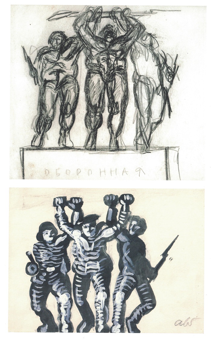 Арефьев. Оборонная серия. Конец 1960 гг. В росте левой фигуры верхней картинки 6 голов, а не 7. В нижней картинке – то же. Плюс персонажи нижней в чём-то, похожем на арестантскую одежду. Характерны слова о вариантах мемориала Аникушина и Арефьева: "Это сопоставление гораздо нагляднее и яснее будет оставить практически без комментариев” (https://stenograme.ru/b/radio/post-blockade-mimesis.html). Трусит искусствовед. Деформации Арефьева в других случаях он объясняет так: "Тело у Арефьева не может уже быть “нормальным”, оно неизбежно деформировано, оно не может оставаться спокойным и целостным. И это тоже можно счесть следствием изменённого войной восприятия” (Там же). Война, в которой победили, не может вызывать ТАКОГО отчаяния. А вот утрата коммунистической перспективы в конце 60-х – может. Это ж уже время достижения ядерного паритета с США. Можно было уже начинать отказываться от тоталитаризма. Ан нет! Хуже того. Необходимость перехода в постиндустриальное общество требовала передачи хозяйственной власти от партии к специалистам. А партия, не желая терять бразды правления, отстранила от дел тех, кто предлагал даже с отсталыми сравнительно со США компьютерами перегнать США за счёт создания автоматизированной всесоюзной системы управления хозяйством. (Арефьев, правда, вряд ли мог знать о таком нюансе отсталости, но он отсталость чувствовал по управлению культурой.) * А пафос моей статье задала досада на самого себя прошлогоднего, удовлетворившегося обобщенным описанием корёжения действительности Арефьевым в применении к такой картине.