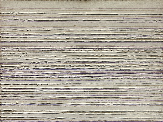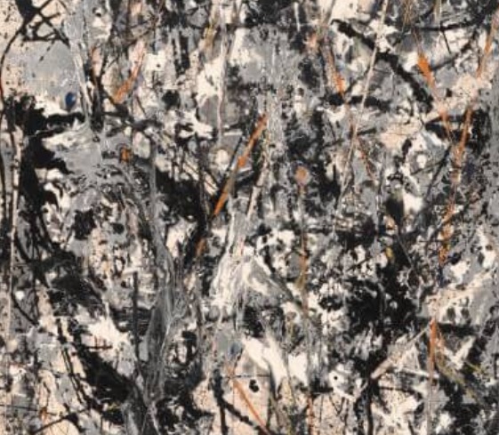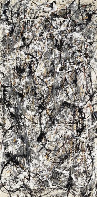 Вулох. Белый пейзаж. 1980. Это похоже на слегка покрытые снегом пахотные борозды в поле. Таким путём Вулох шёл в абстракционизм: всё более и более в пейзажах устраняя натуроподобие. И это – путь в абстракционизм слева, из коллективизма. Так надо было Вулоху иметь склонность к коллективизму и подружиться с единомышленником Айги. А Поллок был прирождённый индивидуалист. "...у него были серьёзные проблемы с общением” - https://rutracker.org/forum/viewtopic.php?t=5352626 Поэтому его знакомство с позитивными теософией и коммунизмом являлось ему "в вопиющем противоречии с существом современной жизни” - там же. Начиналась Великая депрессия в США. – И это тянуло супериндивидуалиста к бегству вообще в принципиально недостижимое метафизическое иномирие.