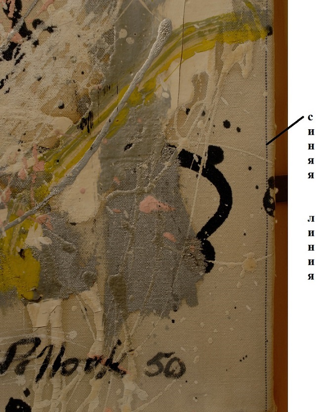 Фрагмент правого нижнего угла картины. "Внимательные зрители “Номера 27” Джексона Поллока , 1950 г., заметят синюю нить, идущую почти параллельно правому краю кадра” (https://nonsite.org/pollocks-formalist-spaces/). Линия маркирует плоскость, на которой всё нарисовано и имеет как бы некоторую глубину светлого над чёрным. Это ж столкновение противоречий-противочувствий, рождающих катарсис: “Неизвестность, что же перед нами”, - та самая Неизвестность, которая была непереносимым свойством Этого мира для Ницше: "…всё материальное — это своего рода движение, служащее симптомом какого-то неизвестного процесса: всё сознательное и чувствуемое — это опять-таки симптом неизвестного” (Ницше Ф. Черновики и наброски 1882-1884 гг. // Ницше Ф. Полное собр. соч.: В 13 томах. Т. 10. — М.: Культурная революция, 2010. — 640 с. https://cyberleninka.ru/article/n/f-nitsshe-protiv-metafiziki-i-essentsializma). Андреева сколько раз ни упомянула этого Гринберга, не упомянула его в связи с таким нюансом, который ведёт к иномирию, а совсем не к позитиву, с которым иномирие не вяжется. 26.05.2023.