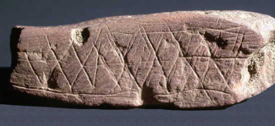 Камень из пещеры Бломбос. 75.000 лет тому назад. страхом пустого пространства, а в целом абстракцию описывал как попытку уйти от нестабильности жизни”. Весь мой пафос насчёт существовании подсознательного идеала автора стоит на том предположении, что автор не мыслитель и потому не ахти какой книгочей. И подсознательный идеал свой выводит из какого-то нюанса духа времени лично, а не вычитывает. Воррингер же – философ и теоретик искусства. Наверно же, Кандинский, Мондриан и Малевич его не читали. Стык 19 и 20 веков ещё до Первой мировой войны выдавал такой нюанс духа времени как огромная тягостность, для выражения которой натуроподобие ну позарез не подходит. Собственно, тот же кошмар был при происхождении человечества 200.000 лет назад (из бесшёрстных и внушаемых мутантов, обречённых шерстистыми внушателями на роль телятины, разводимой и поедаемой {в виде младенцев}). Теоретик Воррингер это почувствовал и написал. Художники стыка веков шли вслепую, методом проб и ошибок. И – двумя путями: коллективистским (экспрессионизм) и индивидуалистским, ницшеанским (постимпрессионисты, фовисты, кубисты, супрематисты и т.д.). И ни они не различали, что путей – два, ни искусствоведы. Хуже того, художники и искусствоведы скатывались в формализм: думали, что корёжение натуроподобия (вплоть, как оказалось, до абстракционизма) – это новизна, что есть хорошо или само по себе, или как выражение новизны окружения. А ужасность этого окружения тоже ими не осознавалась. Хочется думать, что обобщённость Воррингера не от такой слепоты. А вот у Екатерины Андреевой – от неё. Тот факт, что она вытащила на свет этого Воррингера, не означает различения путей к абстракционизму. Что доказывают следующие цитаты. Вот – попытка затушевать то, что Воррингер назвал "страхом пустого пространства”. Если у Воррингера пустое пространство можно ассоциировать с небытием, близость которого ощущала бесшёрстная самка при внушении отдать ребёнка на съедение стаду (жизнь – это то, что есть, смерть – это отсутствие того, что есть в жизни, пустота)… То в пику Андреева привлекает другую цитату: "Герберт Рид полагал, что геометрическая абстракция в первобытном искусстве представляла собой некий “секретный язык”, который освобождал от страха перед неведомым и перед бытием”. Или ещё: "Харольд Розенберг видел в живописи Мондриана [третий {линии} после Кандинского {пятна} и Малевича {геометрические фигуры} открыватель абстракционизма] отрицание трагедии истории… Трагедию истории здесь отрицает некая высшая сила, высшая геометрия судьбы”. Или ещё: "…изначально идеология абстракционизма была связана с кризисным состоянием мира, в котором беспредметность – это плацдарм будущего совершенного бытия”. Ну в самом деле, какой бы ужас ни выражали “измы”, сам факт выдачи образа этого ужаса эстетически позитивен: удача же – дать образ. И с первочеловеком то же: выражено: “МЫ – люди”. Плюс. В результате изготовления экстраординарного предмета (орнамента, из прямых линий состоящего {а прямых линий нигде в природе нет}) внушатель мог впасть в ступор, и дитё оказывалось спасённым. – Позитив не только сущностный (ДЛЯ ЧЕГО так), не только эстетический (КАК), а и прикладной. Работает очень дальний прицел. В СССР абстракционизм был гоним, в РФ – тоже не в фаворе. В отличие от Запада. Если забыть о пути к 