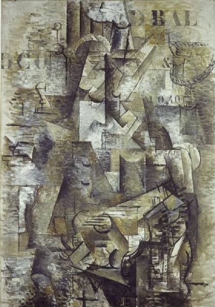 Брак. Португальский. 1911-1912. Пересказывать прочтённое (некоего Майкла Шрейаха, рассказывающего мысли искусствоведа Гринберга) я буду своими словами, потому что я это всё читаю, как булыжники перевариваю. Нельзя вас, читатель, так травмировать. Хватит заумности темы – кубизма, вам, наверняка, душепротивного. Ну и по этому праву я заодно изменю саму логику текста. Отправляться я предлагаю отталкиванием от такой цитаты: "…всё материальное — это своего рода движение, служащее симптомом какого-то неизвестного процесса: всё сознательное и чувствуемое — это опять-таки симптом неизвестного” (Ницше Ф. Черновики и наброски 1882-1884 гг. // Ницше Ф. Полное собр. соч.: В 13 томах. Т. 10. — М.: Культурная революция, 2010. — 640 с. https://cyberleninka.ru/article/n/f-nitsshe-protiv-metafiziki-i-essentsializma). То есть этот тонкошкурый Ницше (а его тонкошкурость была обеспечена не только катастрофой, как она ему виделась, действительности – философски, но и простым абсолютным отсутствием у него женщины) был просто в отчаянии от такого свойства Этого мира, как НЕИЗВЕСТНОСТЬ. Это трудно понять и почувствовать миллиардам людей, оптимистам по сравнению с ним, но что поделаешь. Таких на грани 19 и 20 веков набралось достаточно много, чтоб прославиться на весь мир вопреки непонятности такого мироотношения миллиардам. Вот эта Неизвестность потрясала и кубиста Брака. Буквы обозначали плоскость, на которой они изображены, а остальное изображение имело некую, пусть и небольшую, иллюзорную глубину. – И вопрос – что перед нами: плоскость изображения или изображение? – Ответить не возможно. Какая-то воплощённая НЕИЗВЕСТНОСТЬ. И это ужасно! Что Этот мир – такой. То есть, понимай, надо вон из этого ужаса в принципиально недостижимое метафизическое иномирие, может, там этого ужаса нет. (И хорошо хоть то, что удалось подвести к образу этого иномирия – получаешь удовольствие от всё-таки некой удачи.) Гринберг это всё назвал "воссозданная плоскость” (https://nonsite.org/pollocks-formalist-spaces/). – Представляете теперь, как бы вы ничего не поняли, если б я цитировал. Описанное есть такое элементарное соображение, что искусствоведы, наверно, из инстинктивного и подсознательного стеснения за такую элементарность просто всё мутят по-страшному, чтоб выглядеть внушительно. Не лучше выглядит и сам Брак, всё иначе и иначе устраивающий это одно и то же, одно и то же противоречие, какое пространство перед нами: плоское или с глубиной.