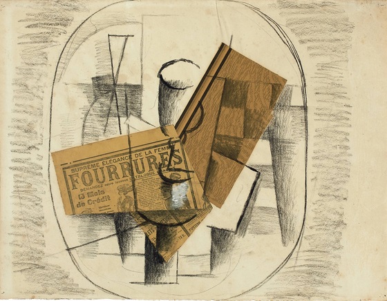 Брак. "Бокалы и бутылки (меха)". 1913. Уголь, обои и газета на бумаге. Тут одно – поверхность бумаги, на которой находится натуральная газета, а другое – некая глубина, которую изображает бокал (бутылку я не вижу {разве что горлышком вниз и без дна}; меха – тоже, хоть FOURRURES – это меха по-французски). И так можно исследовать много что у Брака. 26 мая 2023 г.