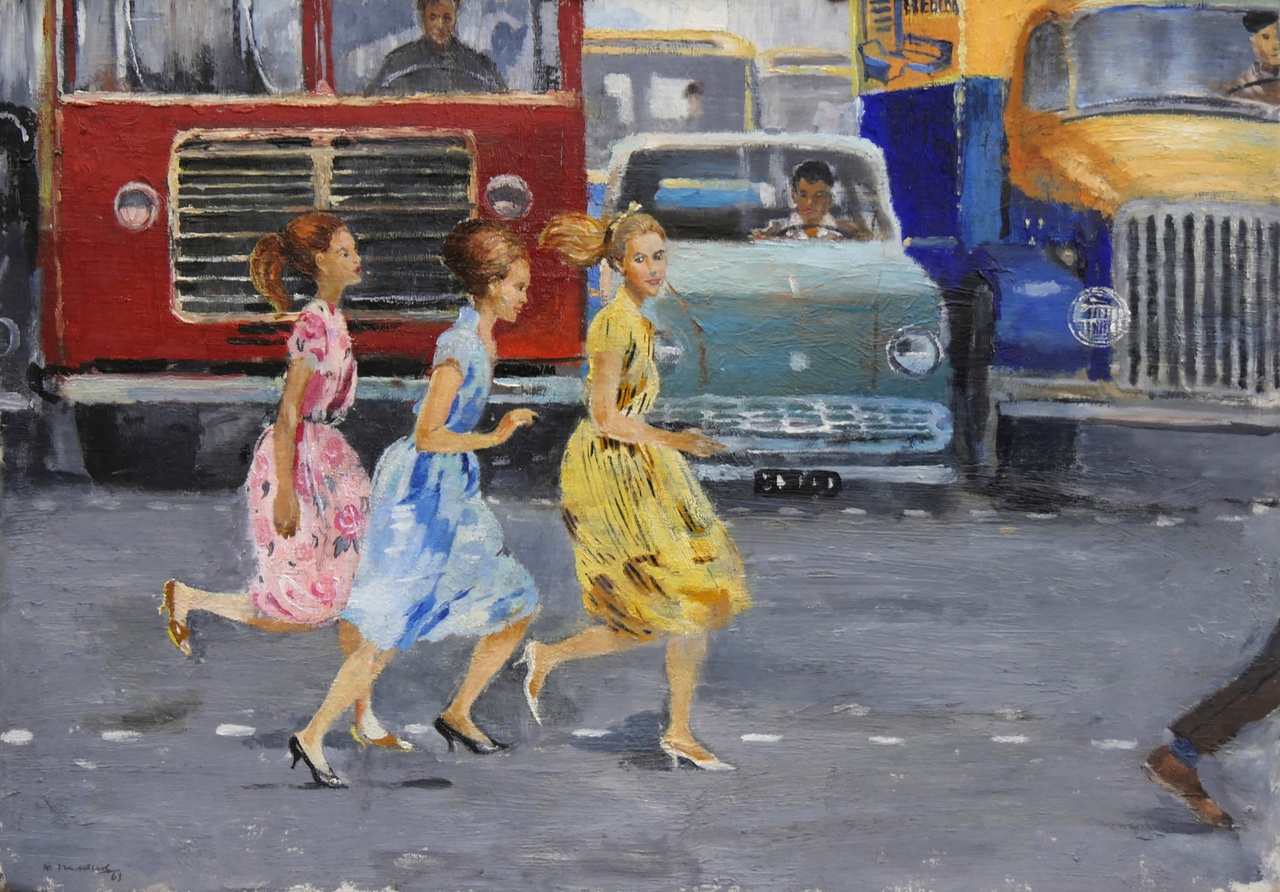 Пименов. Бегом через улицу. 1963. Холст, масло. Тут абы какая жизнь – визуальная хрупкость девушек в этом мире патриархата, их малозначительность в этом мире. А хвала – открытый цвет их платьев.