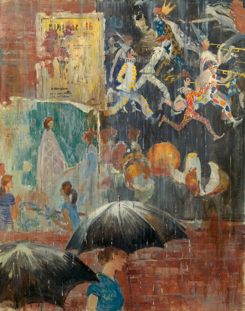 Пименов. Мокрые плакаты. 1973. Холст, масло. Существование некоторых вещей можно уподобить жизни маленьких людишек, какими вокруг является большинство. Например, плакаты. Хвала их “жизни” - это их яркость. А “абы какая жизнь” – необходимость мокнуть под дождём.