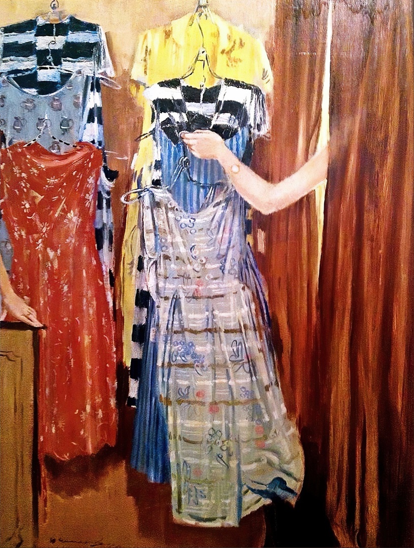 Пименов. У примерочной. 1960. Холст, масло. Абы какая жизнь это даже не необходимость одеваться не в индпошив (итальянки, например, были недовольны планом Маршалла, заставившим послевоенную Западную Европу покупать американский ширпотреб). Плохо, что грубовата расцветка платьев. Отрыжка массовой культуры. А хвала тут дана яркостью красок.